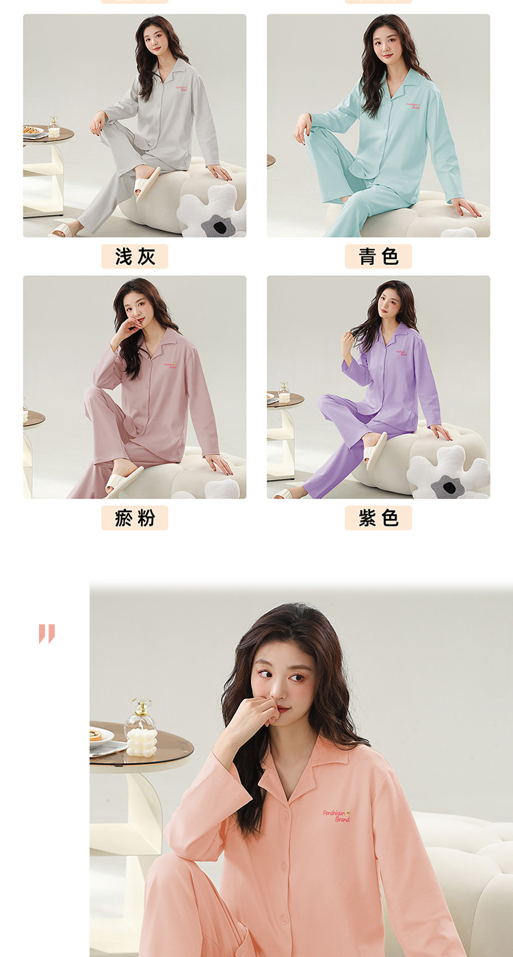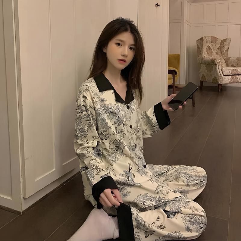 睡衣女春秋新款开衫翻领拼色长袖长裤国风水墨仿纯棉家居服两件套