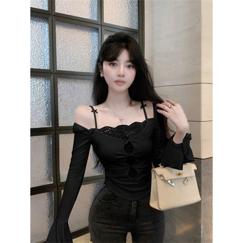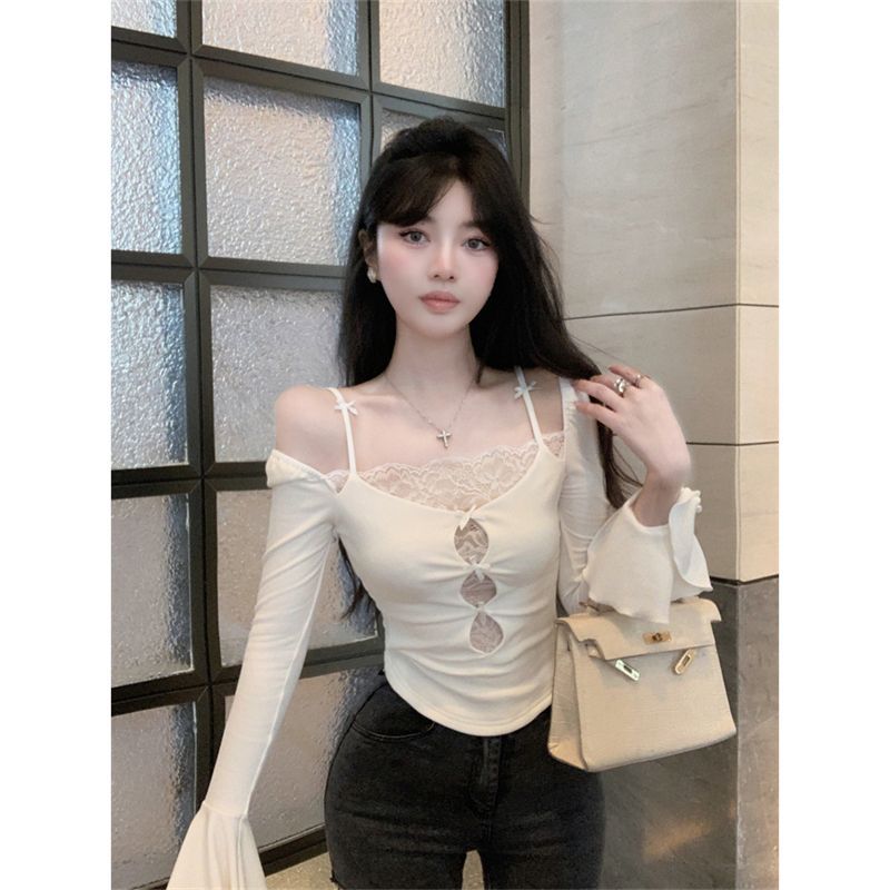 春の韓国版の気質レースはUネックのラッパの長袖のtシャツの女性の純欲な風のデザイン感をつなぎ合わせます。