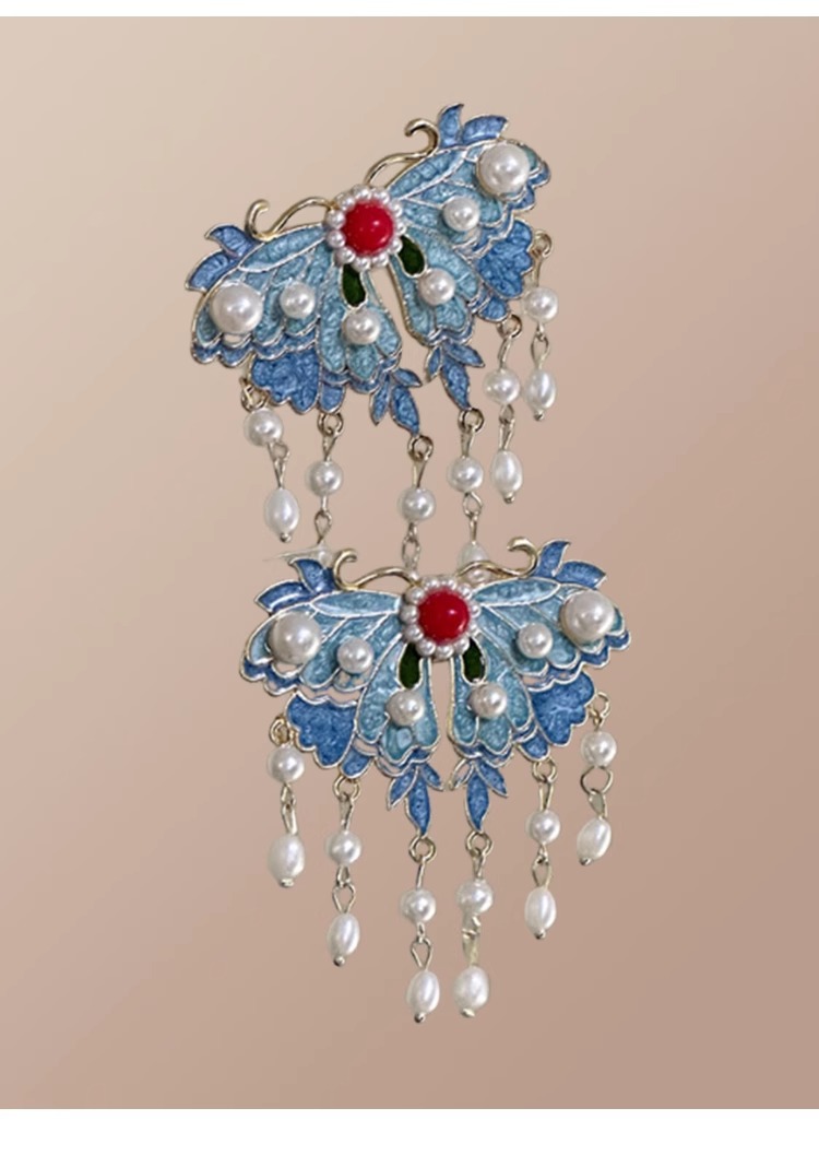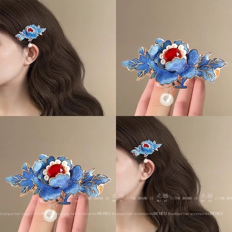 国色牡丹 ~ 焼藍真珠流蘇ヘアカード女性2025新型古風前髪サイドクリップ漢服旅行サイドクリップ