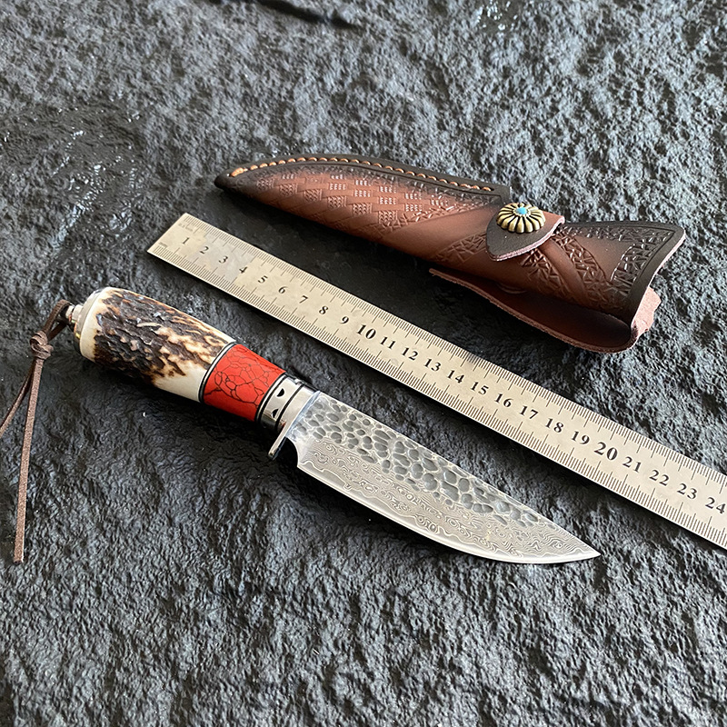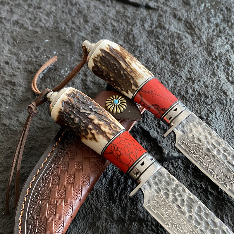 ナイフ フルーツナイフ 刃物 金属製 鹿角 レッドターコイズハンドル ダマスカス鋼刃 168g シース付き