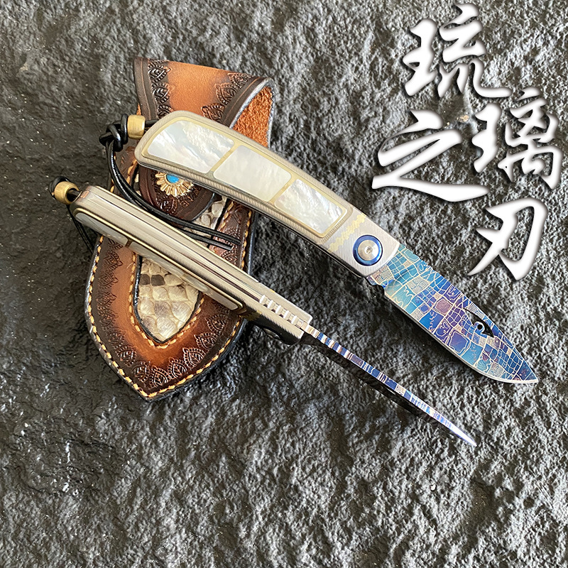 ナイフ フルーツナイフ 折りたたみ式 白貝白銅チタン鋼ハンドル スウェーデン輸入ダマスカス鋼刃材 ブルー焼き仕上げ