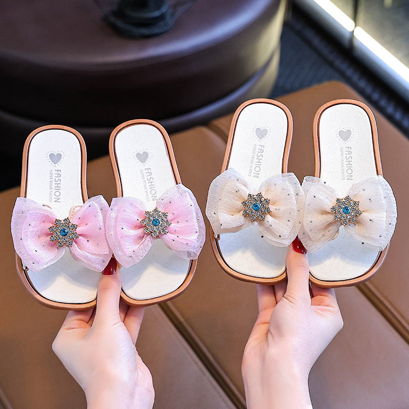 女の子用スリッパ、おしゃれな韓国風、可愛いリボン付きプリンセスサンダル、夏用、子供用、室内外兼用、つま先挟みタイプ