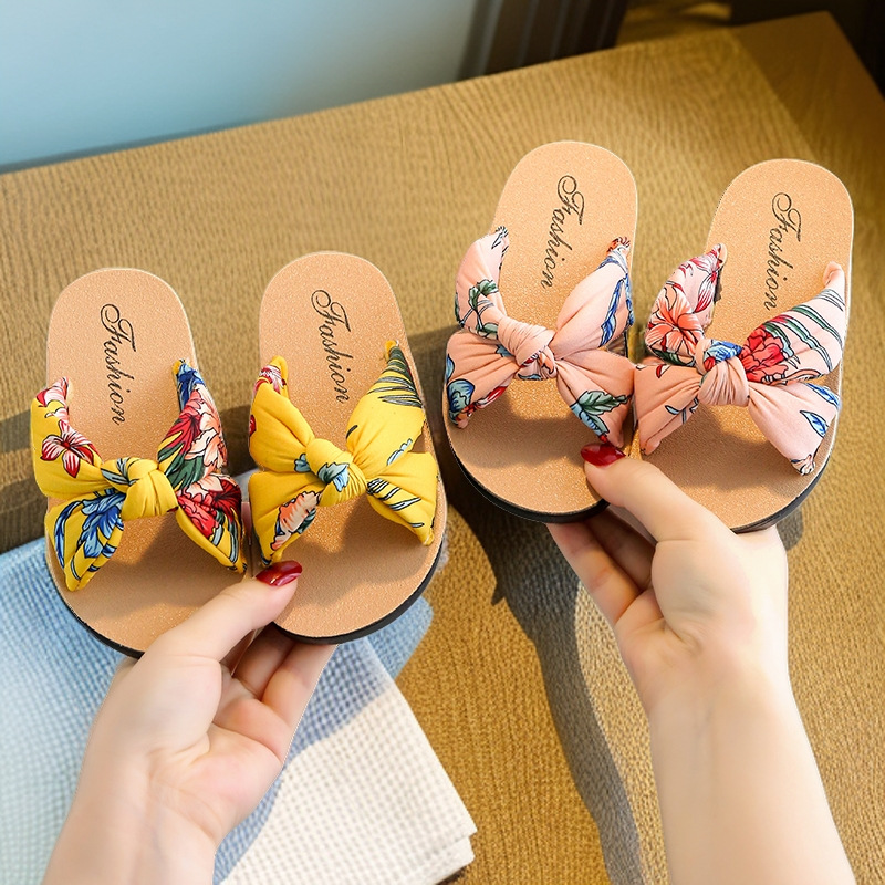 子供用スリッパ女性2025夏の新型百合蝶結びの海辺の一字は滑り止めビーチサンダルを履いています。