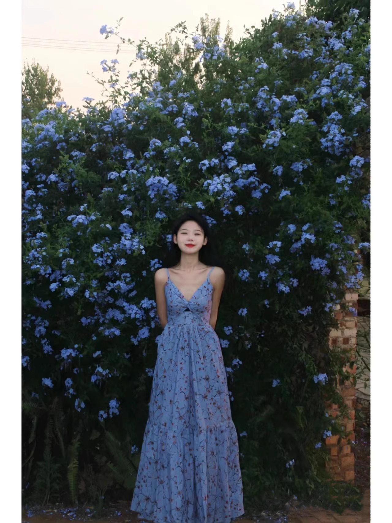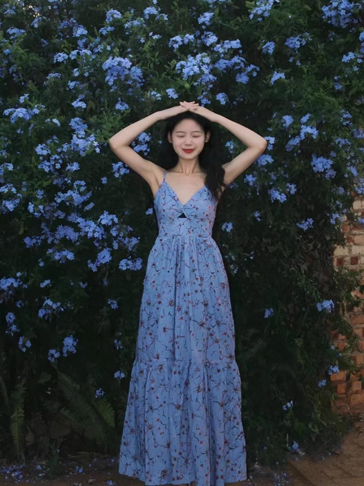 フランスvネックの露背の青い花のストラップのワンピースの女性のお茶の中の茶気は腰を収めてやせているカジュアルなロングスカートの夏を現します。