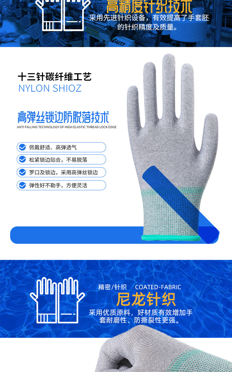 炭素繊維静電気防止手袋PUは、手のひらナイロン浸漬作業電子工場の保護クリーン手袋卸売りを指している