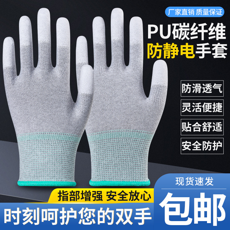 帯電防止労働保護手袋炭素繊維 PU コーティングされた指コーティングされた手のひらエレクトロニクス工場防塵通気性非スラグ卸売滑り止め