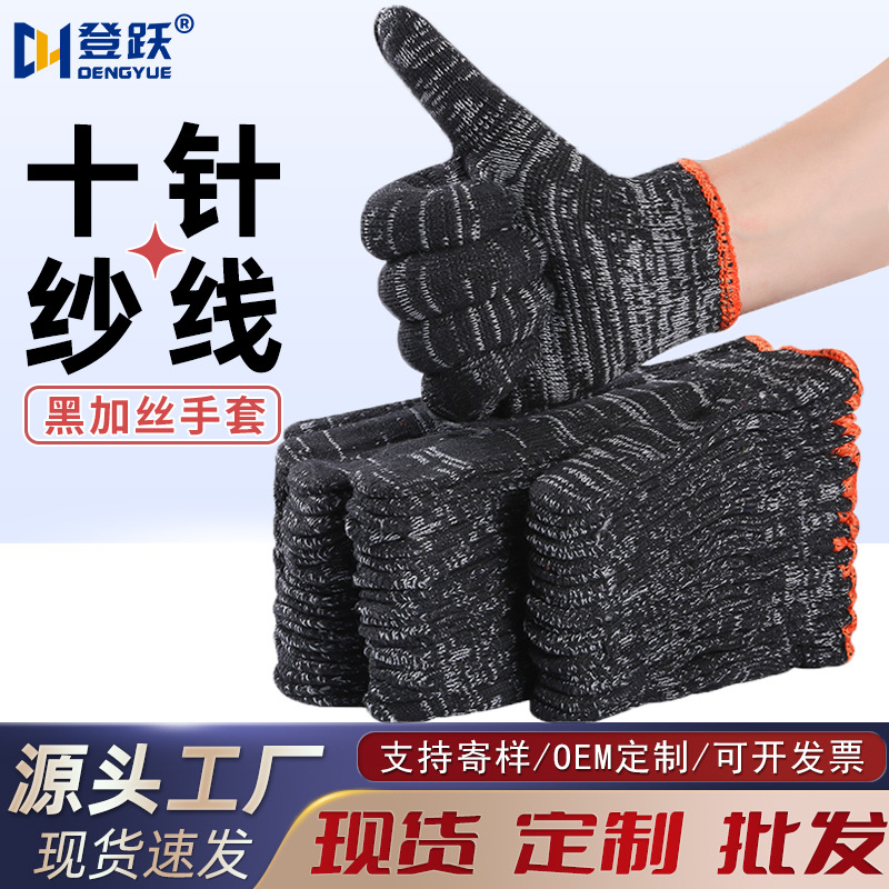 黒加糸労働保護綿糸手袋工事現場の自動車修理作業黒糸汚れ通気耐摩耗性十針手袋卸売り