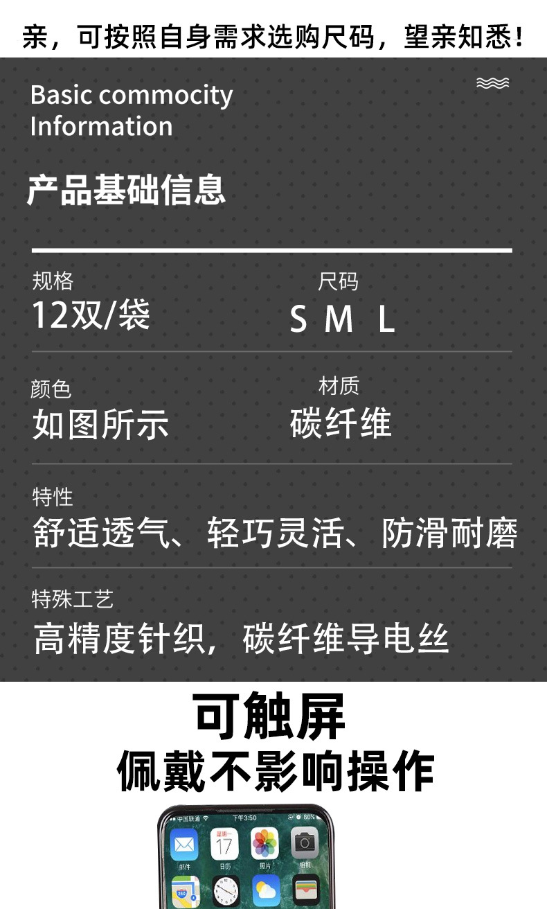 3本指タッチパネルナイロン手袋芯13針炭素繊維薄い通気性日焼け止め高弾運転労働保護手袋