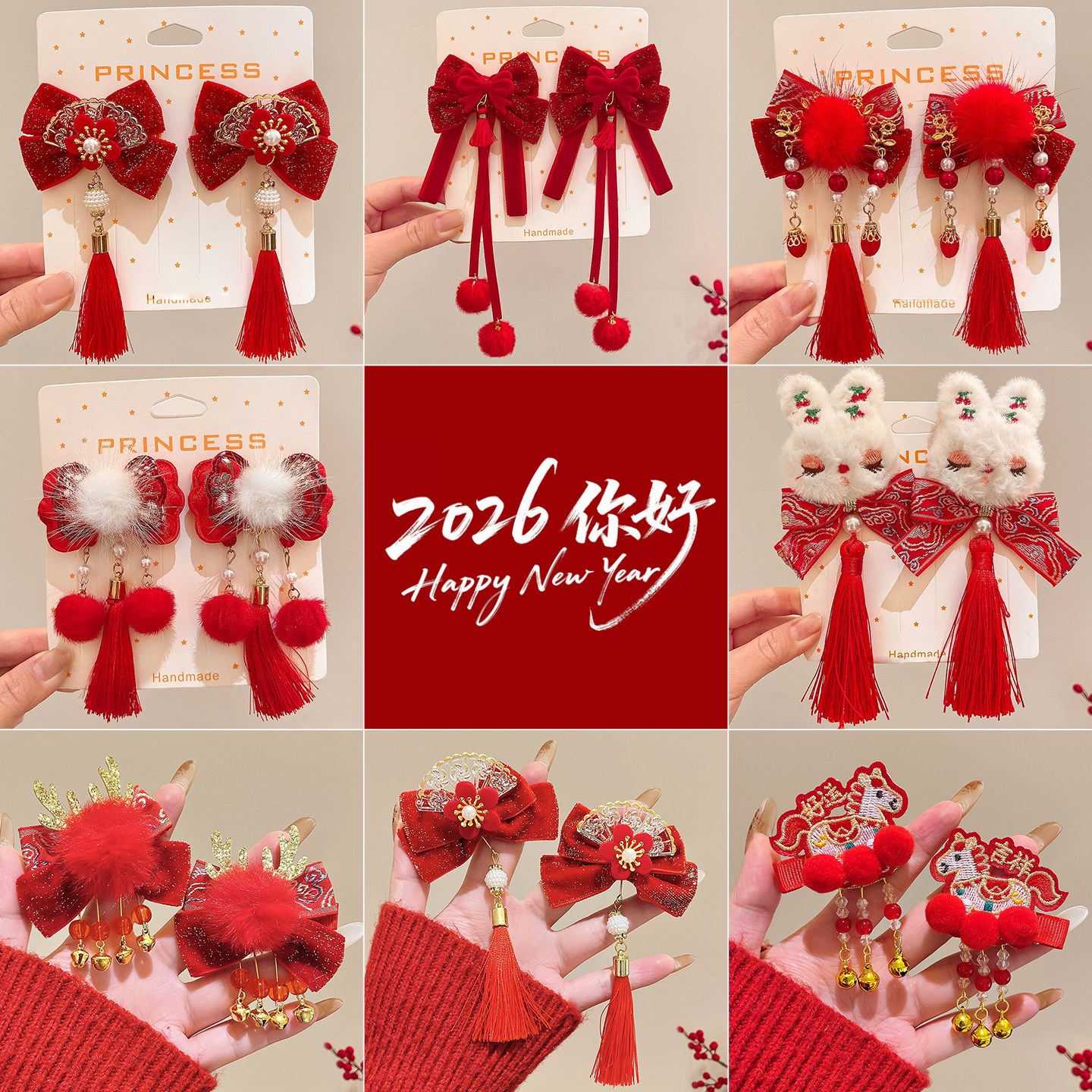 新年发饰儿童红色蝴蝶结发夹过年喜庆汉服古风夹子爆款货源批发