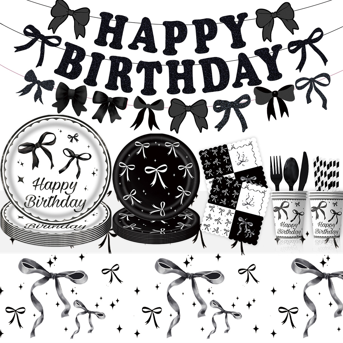 アマゾン白黒ちょう結びテーマ誕生日パーティー食器使い捨てテーブルクロス紙トレイ紙コップ装飾品
