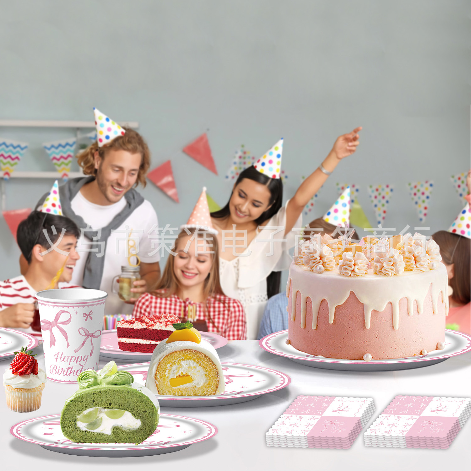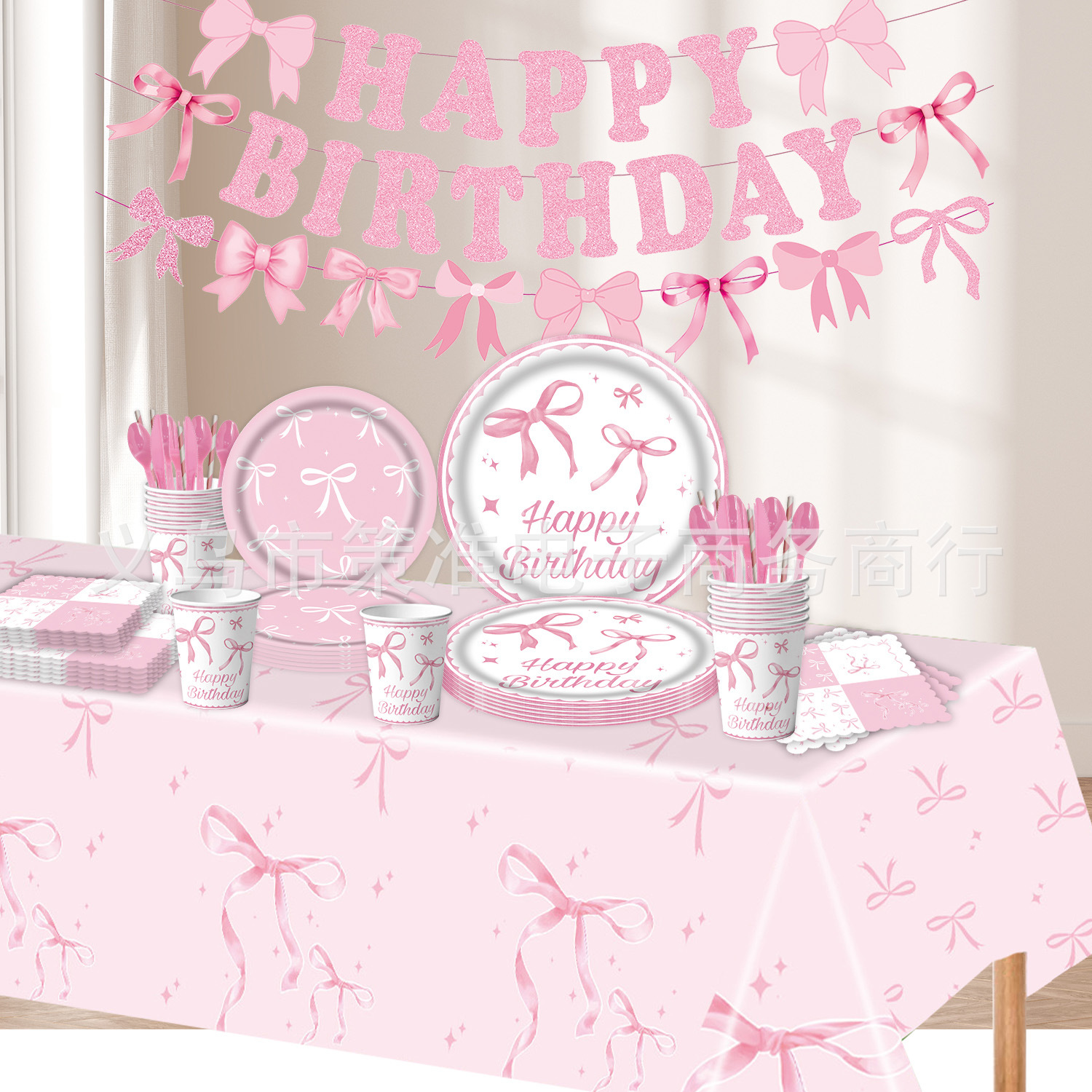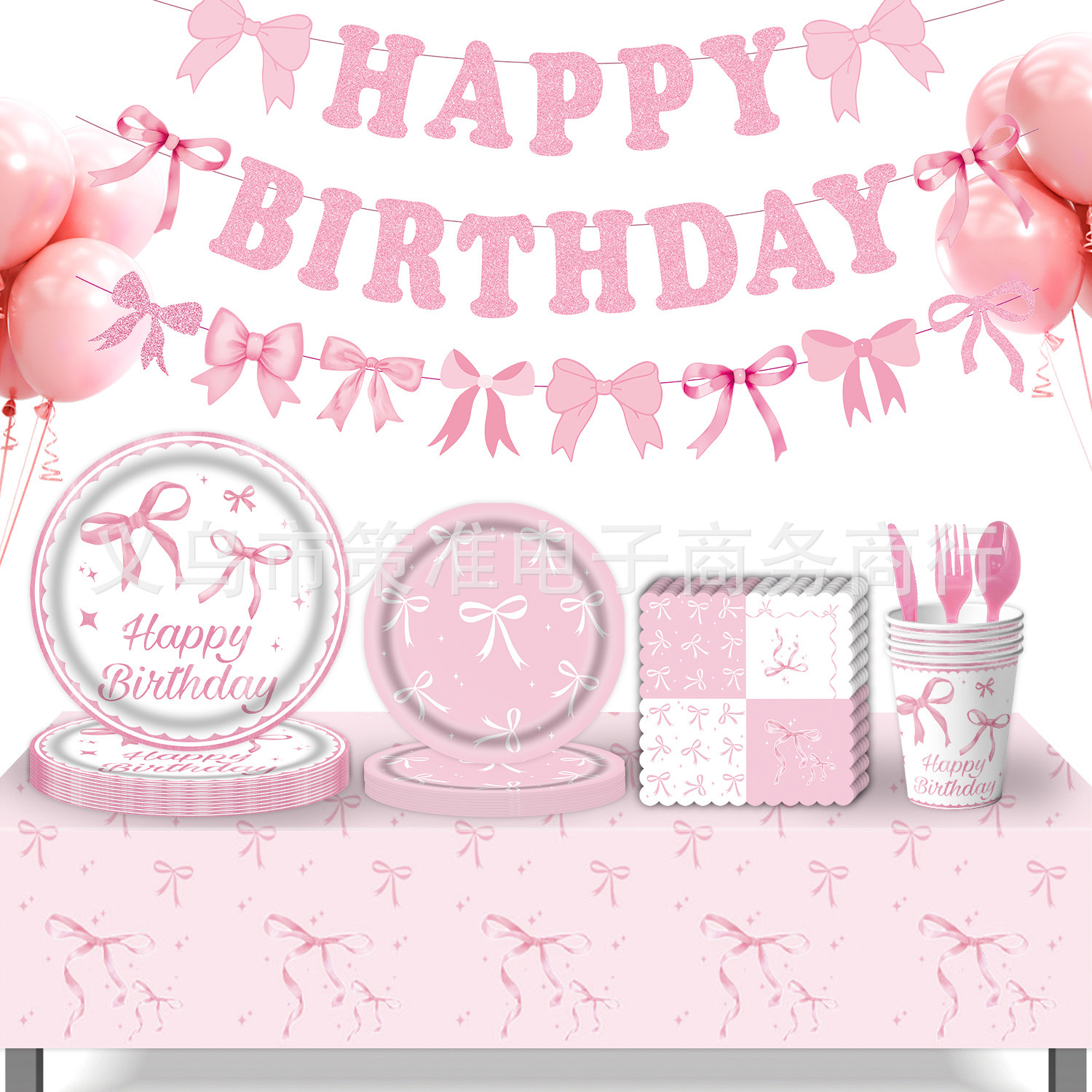 クロスボーダー热い贩売ピンクちょう结びテーマ诞生日パーティー用品ペーパートレイ纸カッププルフラッグテーブルクロスアレンジセット