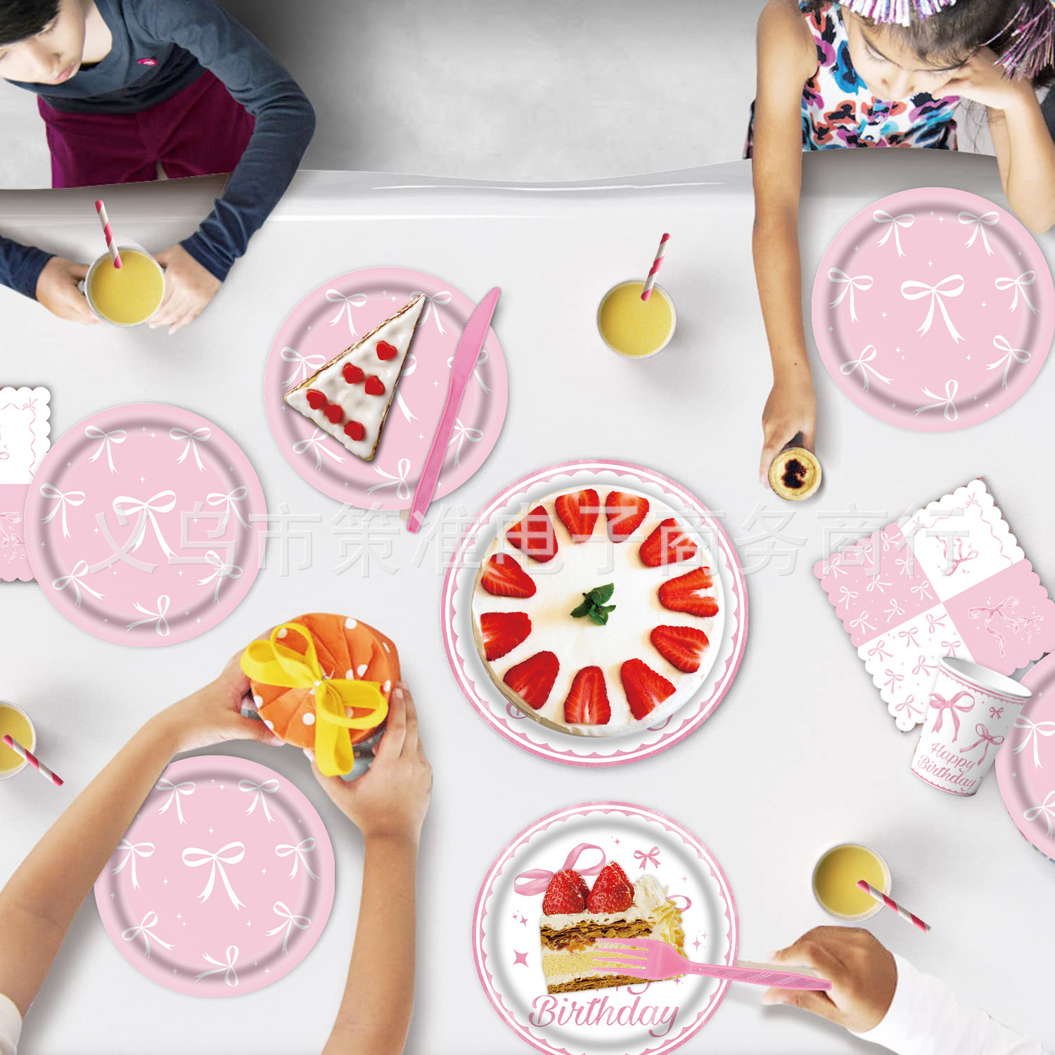 美少女跨境粉色蝴蝶结主题生日派对一次性纸盘纸杯拉旗桌布布置套