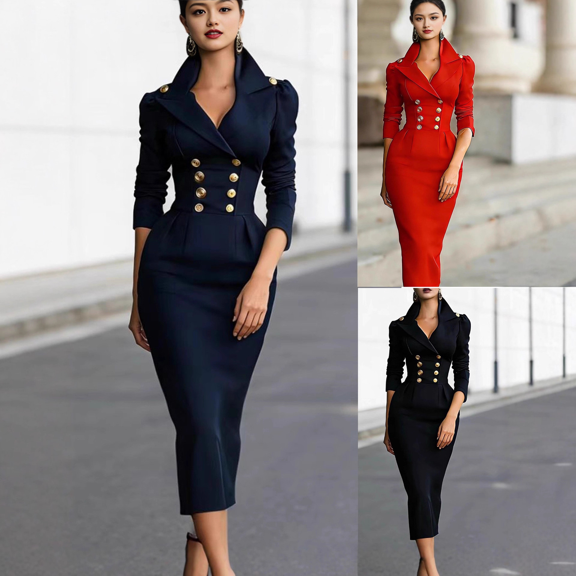アマゾンクロスボーダー欧米レディース秋新作外国貿易wishラペル長袖ダブルボタン作業スーツワンピース