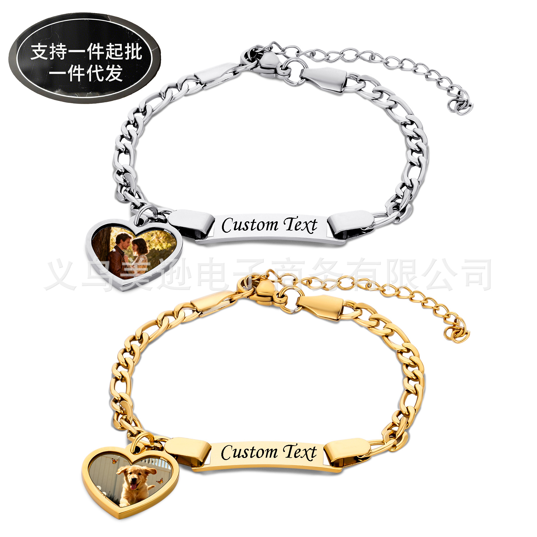 欧美热卖热转印照片爱心吊牌手链 不锈钢古巴链个性刻字儿童手环