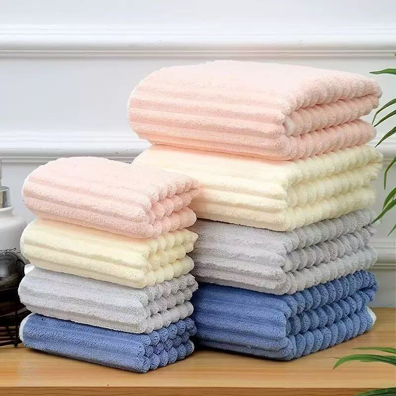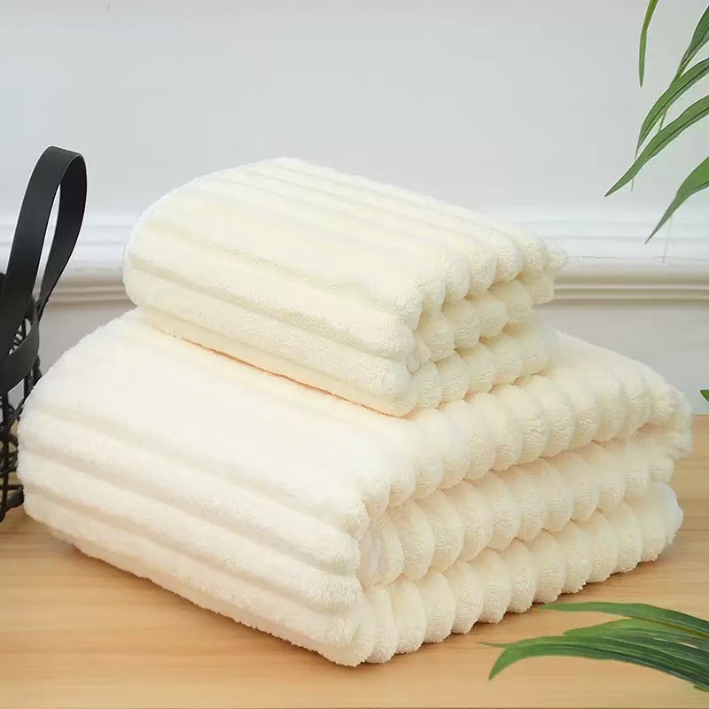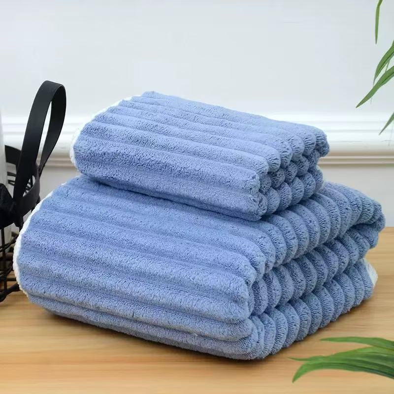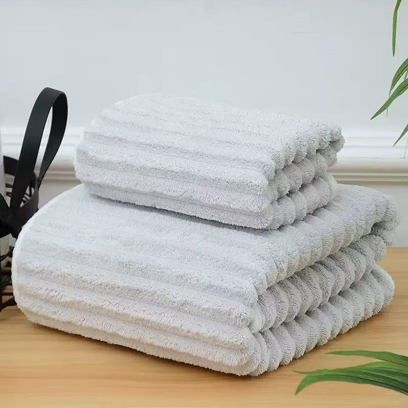 跨境珊瑚绒宽条毛巾浴巾吸水速干亲肤柔软透气洗脸洗澡居家日套装