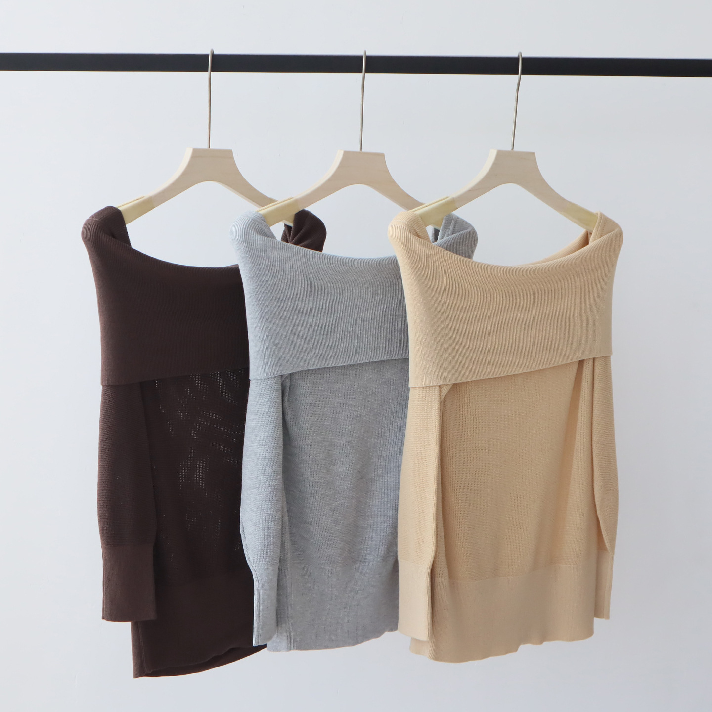 莱赛尔天丝春季穿搭针织衫长袖纯欲风露肩一字翻领上衣女斜肩外搭