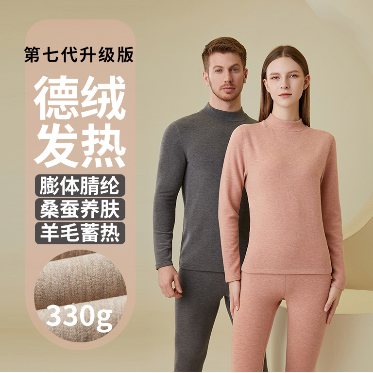 ウールシルク混紡デロン素材のハーフタートルネック男女兼用保温衣セット、裏起毛・厚手の保温下着・秋服