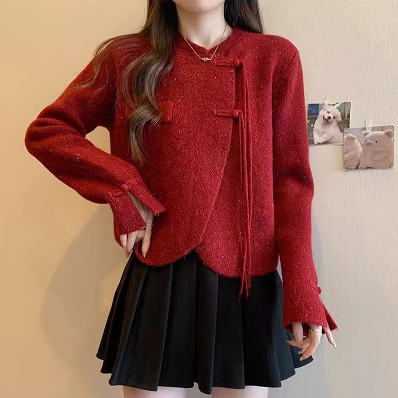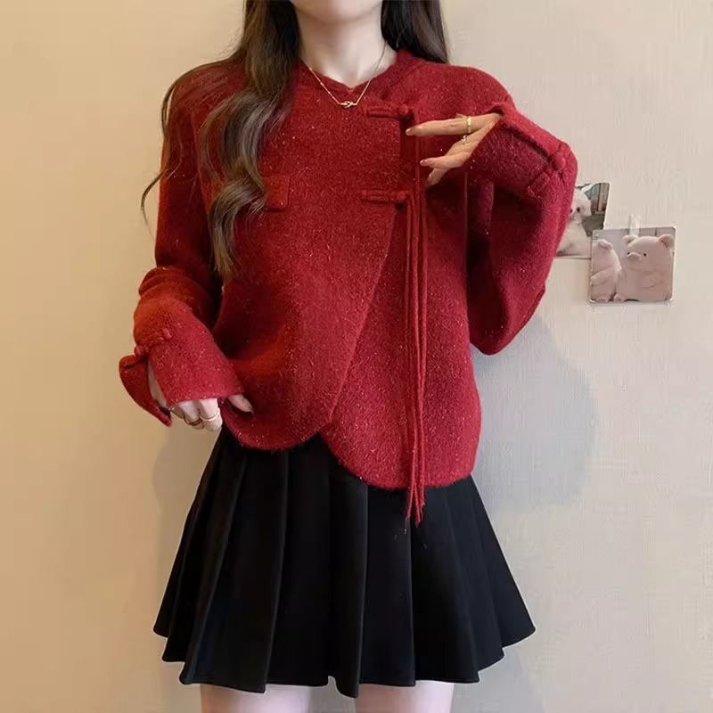 春秋高级感减龄穿搭女新款小众红色新中式针织毛衣半身裙两件套装