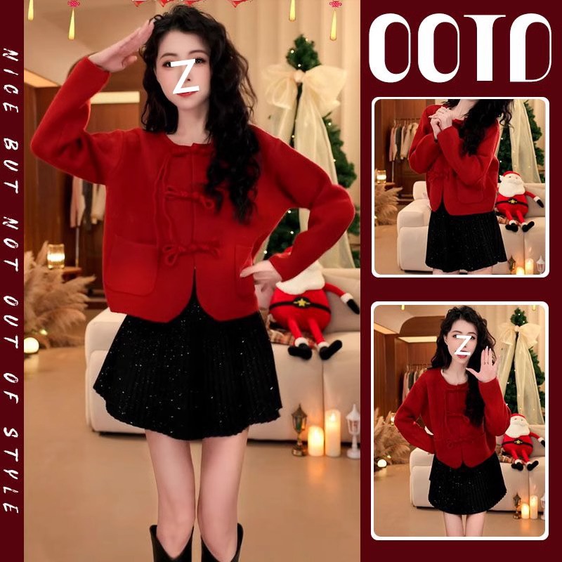 2025春の新型の小香風の新しい中国式の赤いニットのセーターの女性のファッションのカーディガンのコートの百倍のスカートのスーツ