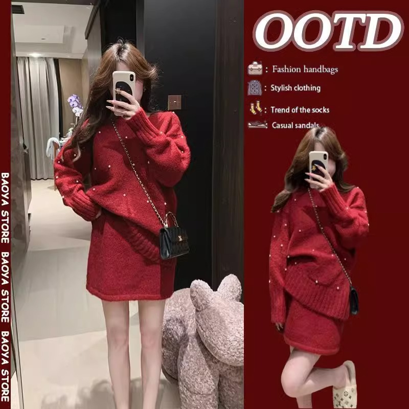 春は女性2025の新型韓国系新年の赤い真珠の丸首のニットの高腰の半スカートの2つのセットを着ます。
