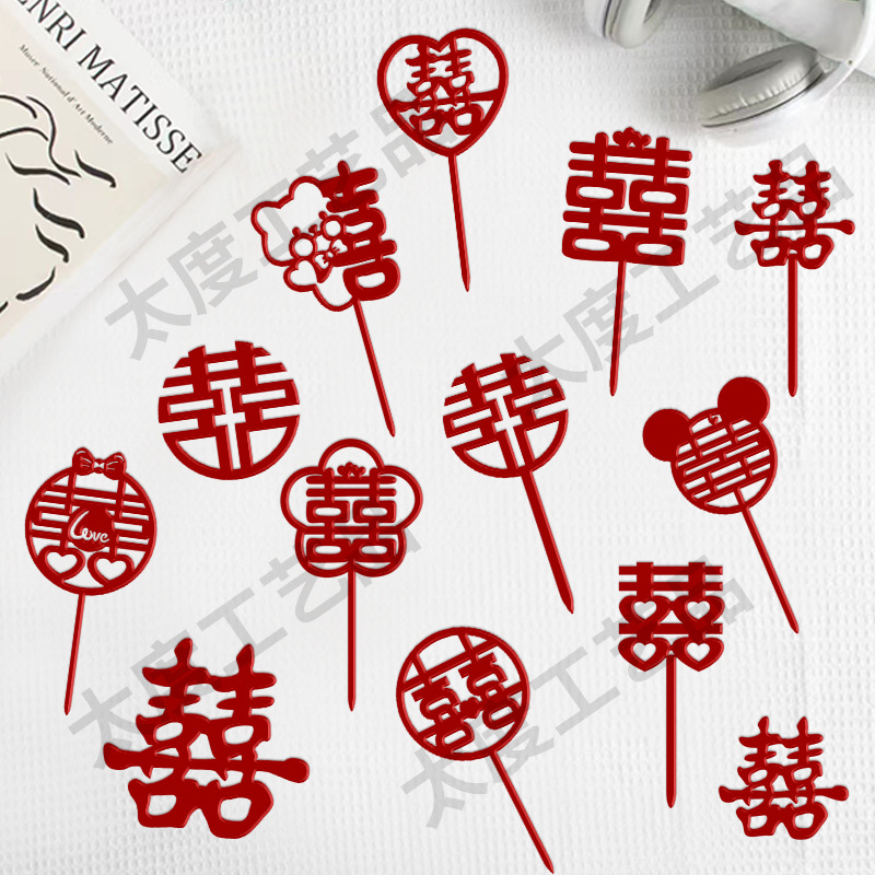 結婚プロポーズ婚約愛双喜字ケーキ装飾アクリル紅喜置物デザートアクセサリー
