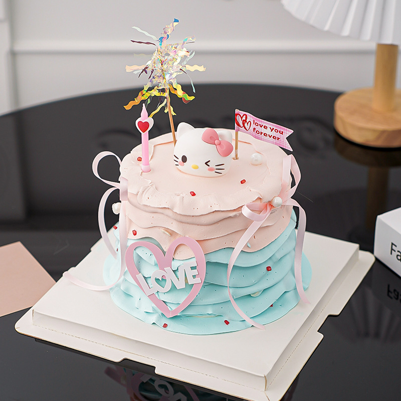 情人节2.14快乐蛋糕装饰蝴蝶结KT猫摆件小情侣表白love亚克力插件