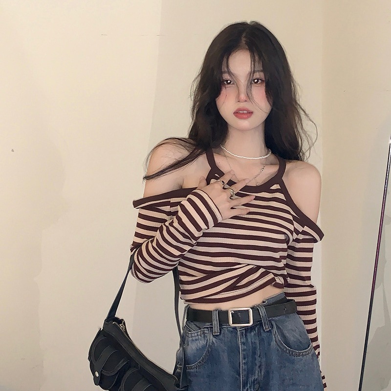 デザイン性の高いオフショルダーストライプTシャツ レディース 2025年秋新作 個性的なタイトフィット長袖 細見えショート丈学生向けトップス