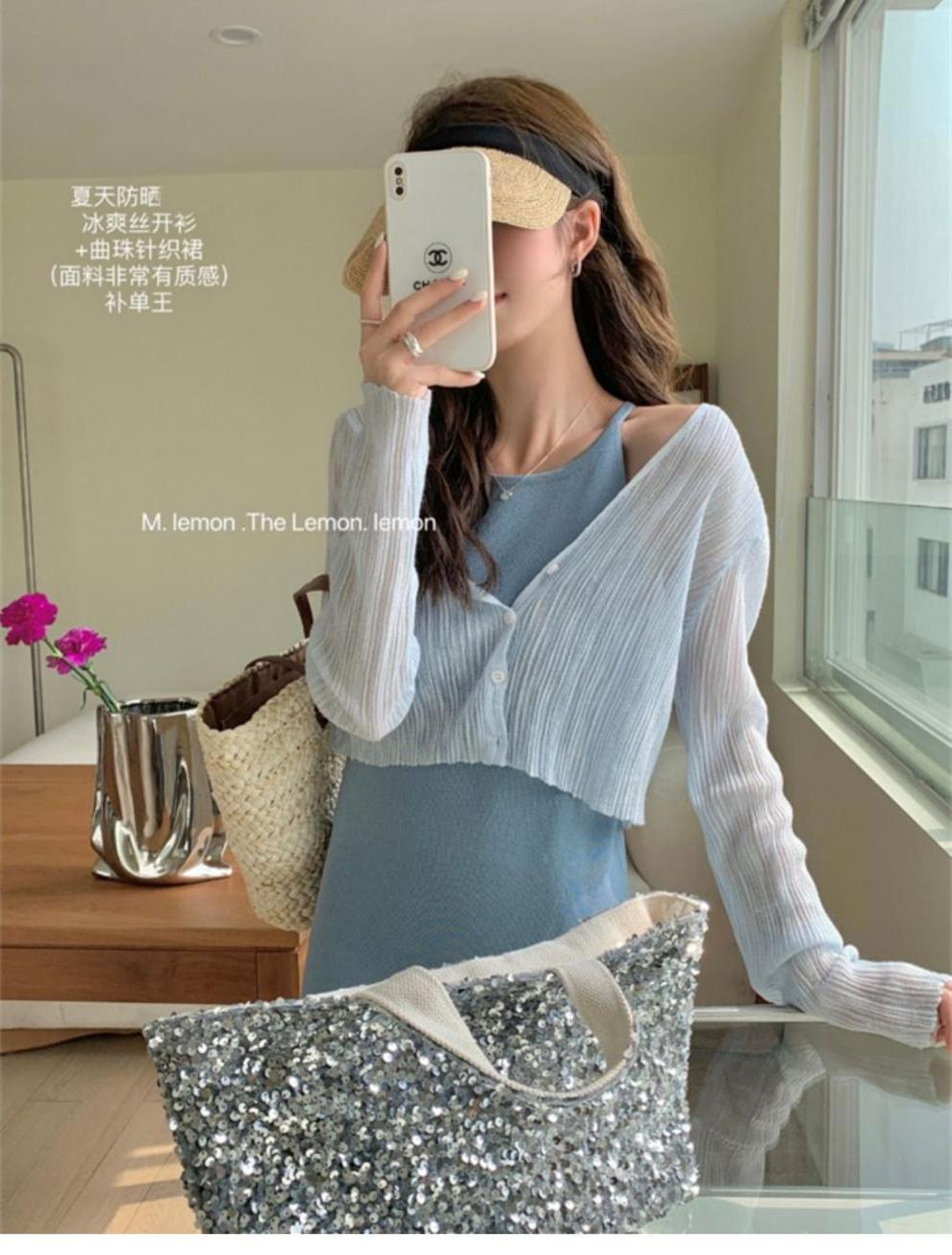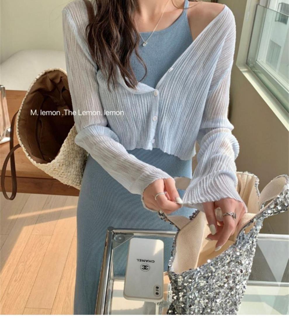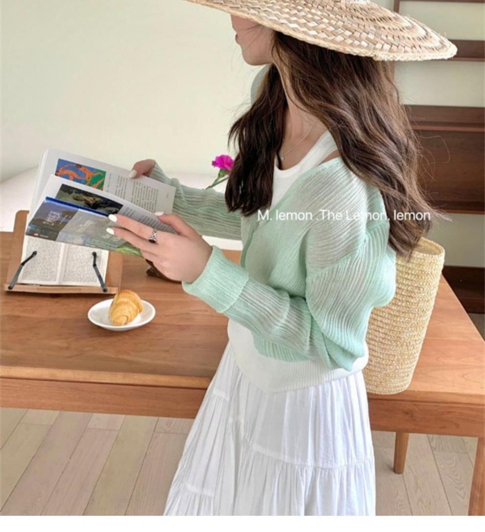 白いアイスニットの日焼け止めカーディガンの女性の薄いコートのショールの夏にストラップのワンピースの外にブラウスを掛けます。