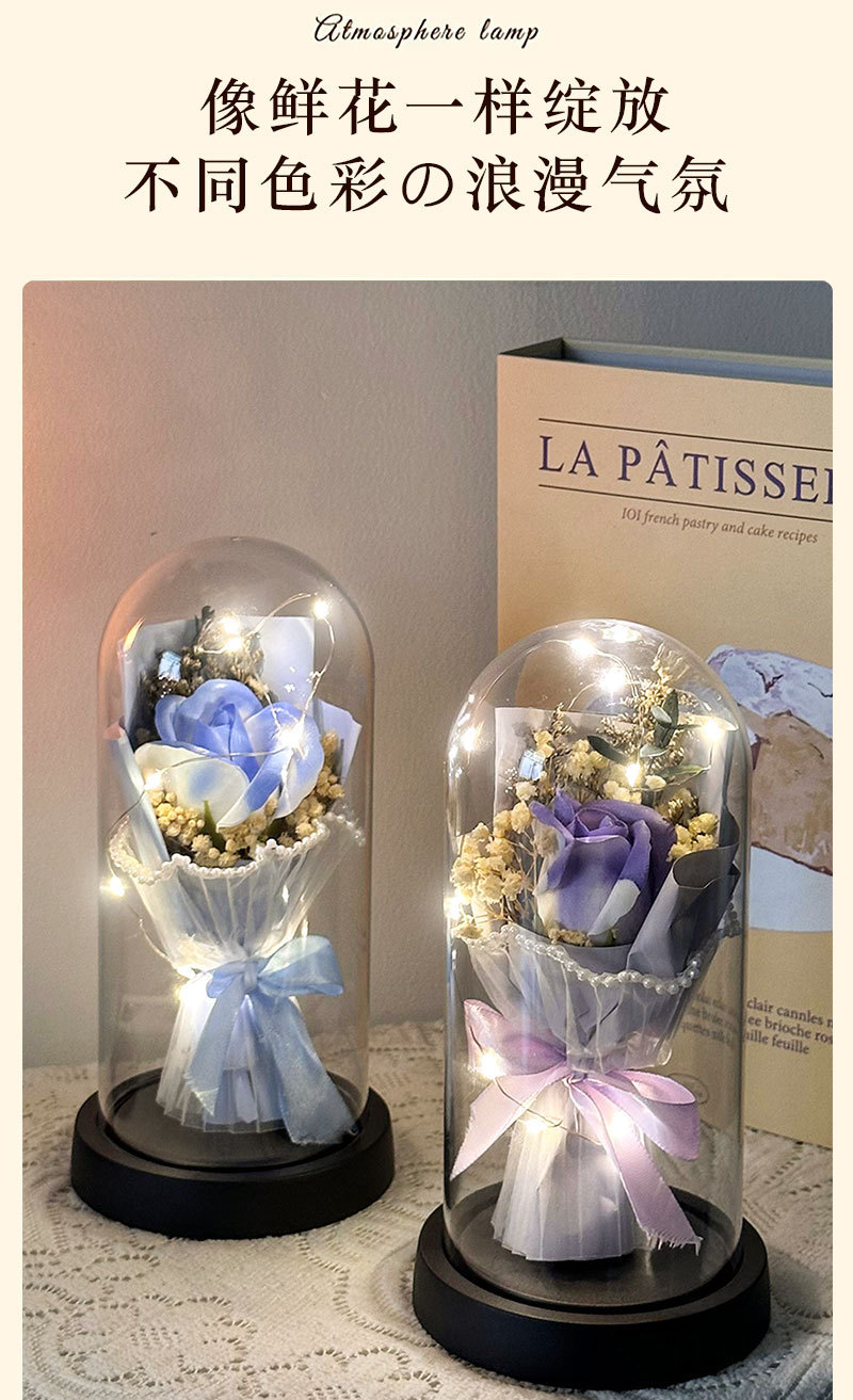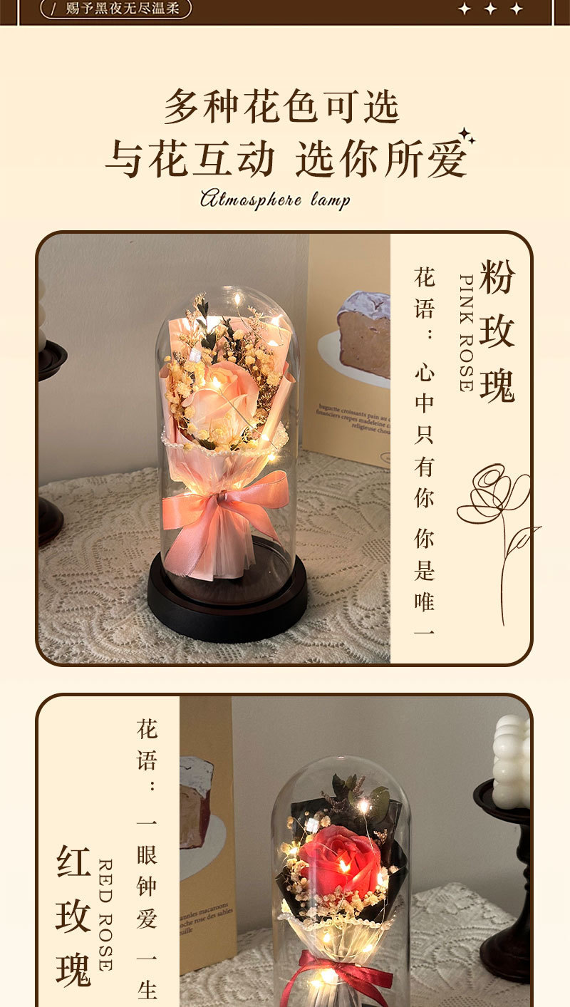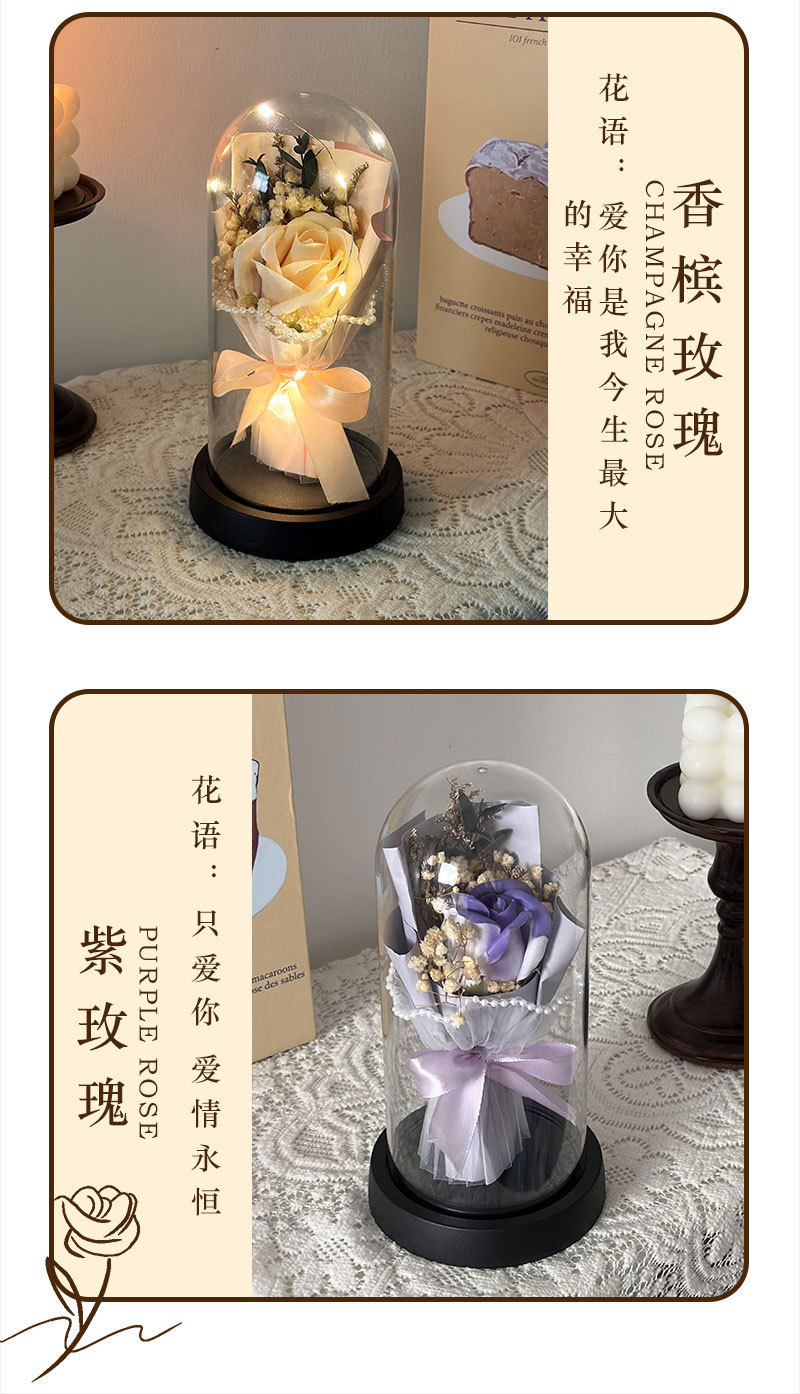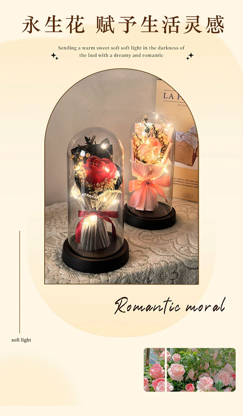 跨境永生花玫瑰罩加灯生日礼物仿真花女生送闺蜜三八情人节灯饰