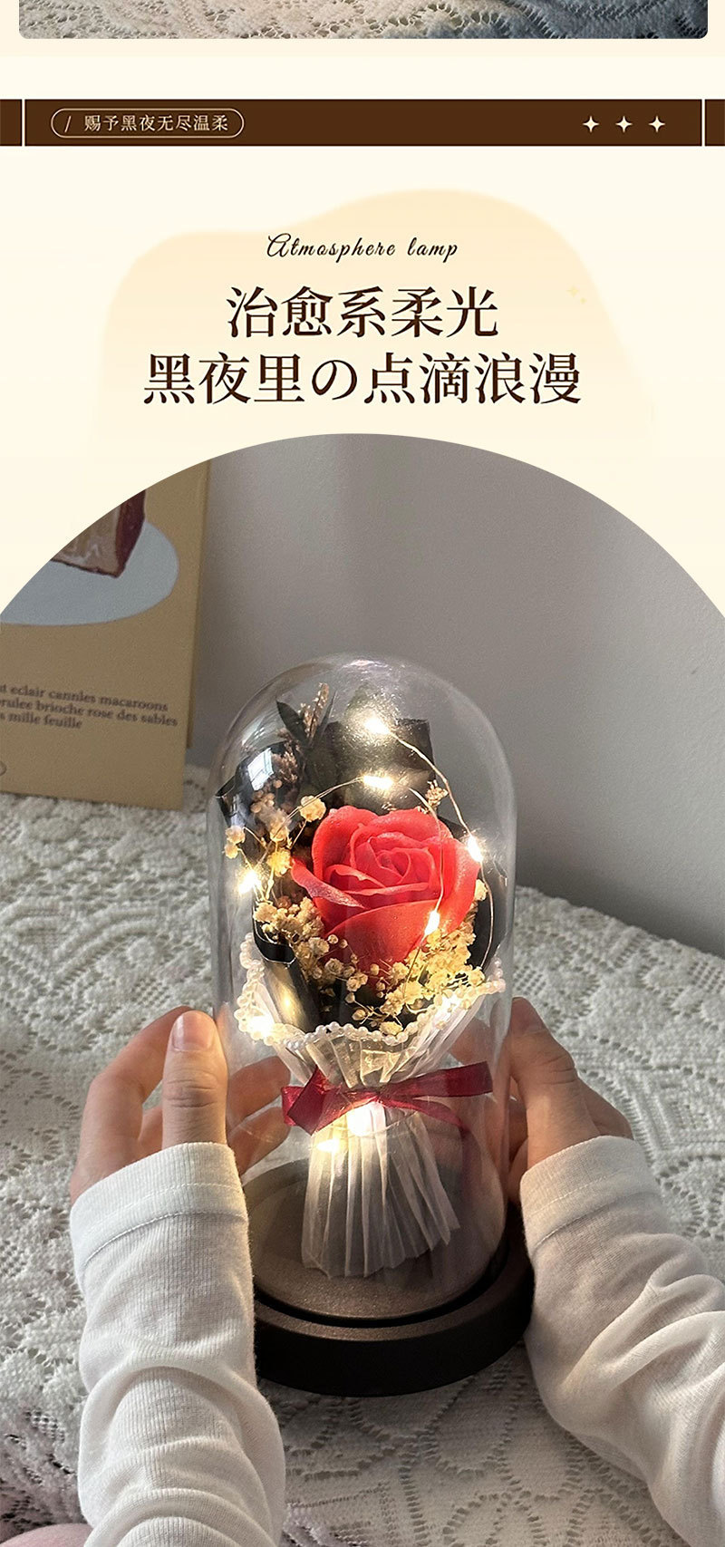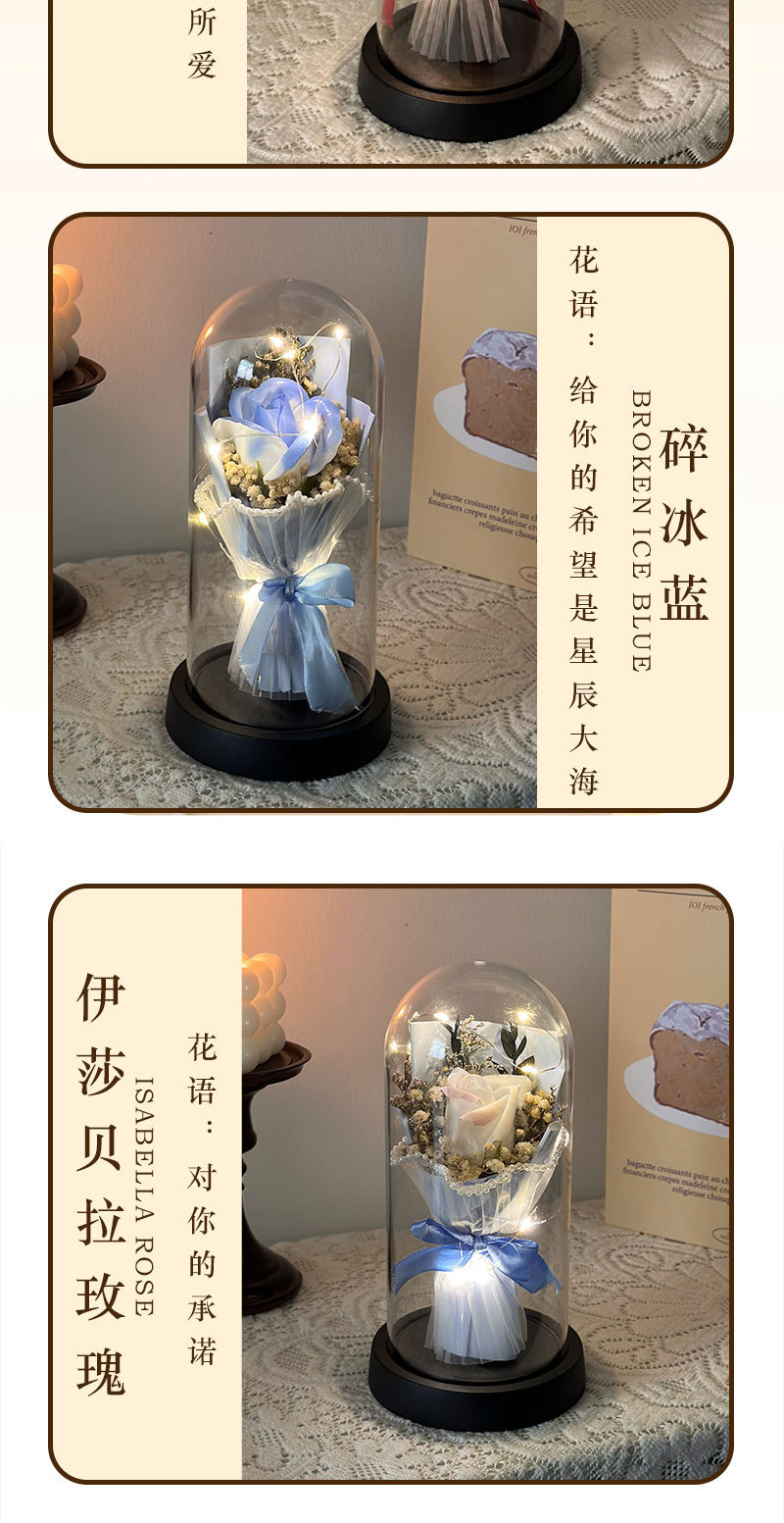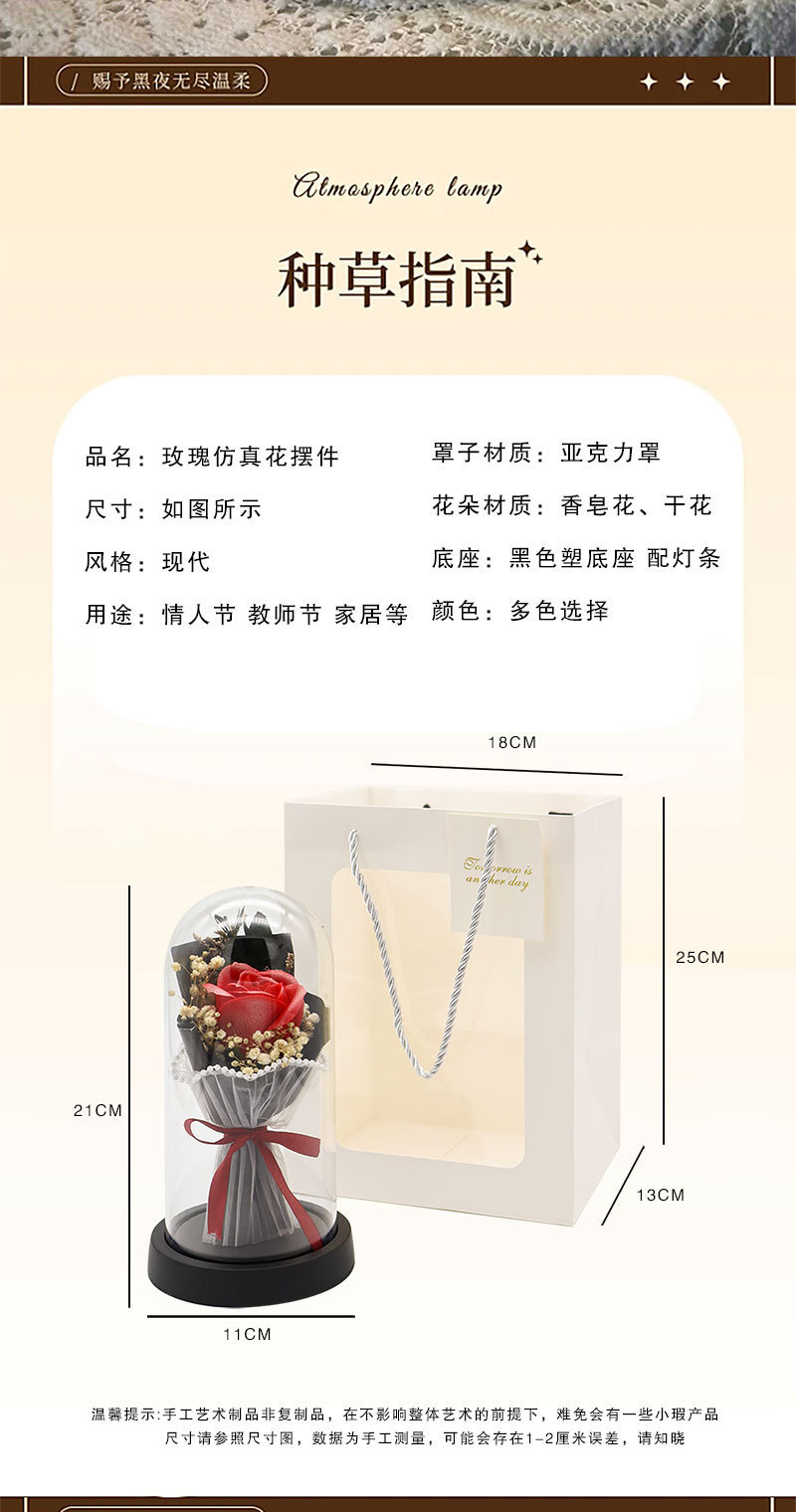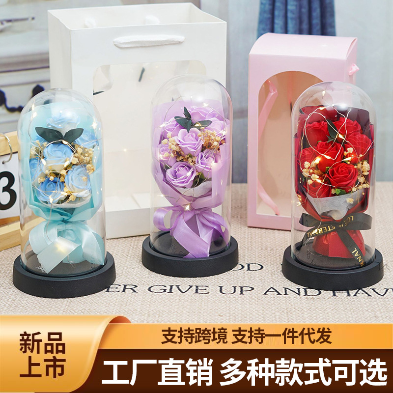 跨境永生花玫瑰罩加灯生日礼物仿真花女生送闺蜜三八情人节灯饰