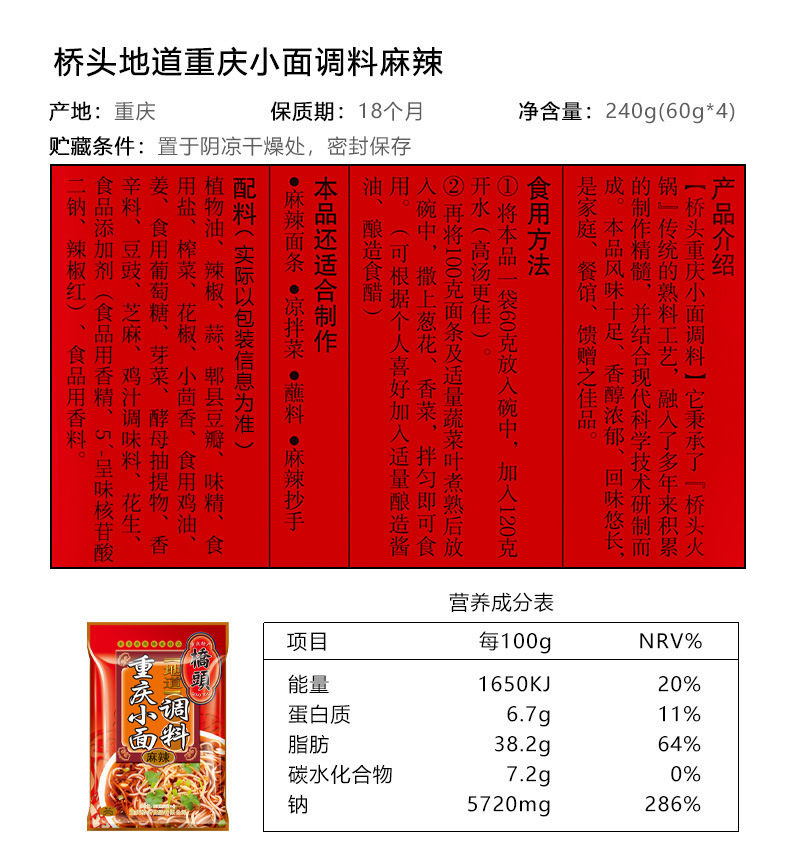 梱包仕様 スパイシー重慶麺調味料 240g (60g*4),スパイシー重慶麺調味料 240g*2 (60g*8),スパイシー重慶麺調味料 240g*3 (60g*12),スパイシー重慶麺調味料 240g*5 (60g*20)