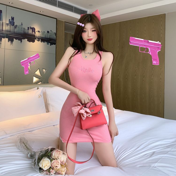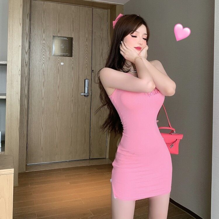 気質純欲風ストラップワンピース女性夏タイツ痩せセクシーギャルウエストピンクお尻ショートスカート