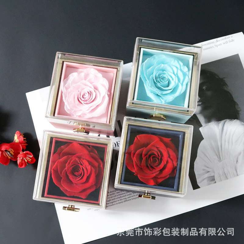 国境を越えた回転式バレンタインデー誕生日プレゼントローズプリザーブドフラワーギフトボックスアクリル高級ジュエリーボックス