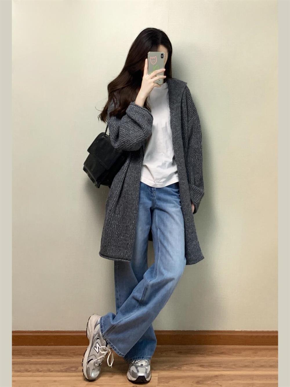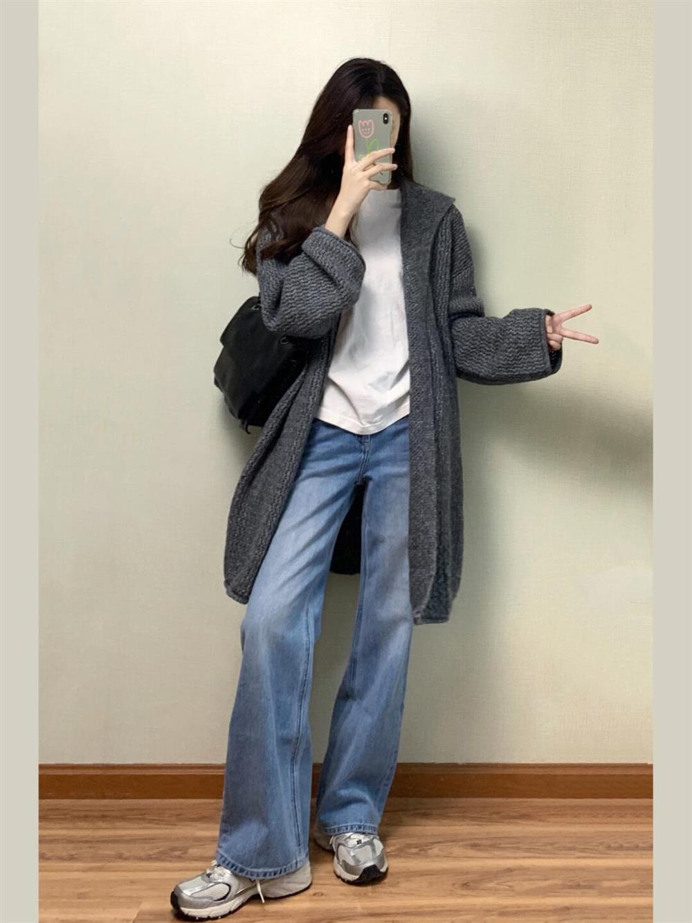 グレーの中長のフード付きセーターのコートは、女性の朝と秋の韓国系の雰囲気がゆったりしていて、だらだらしています。