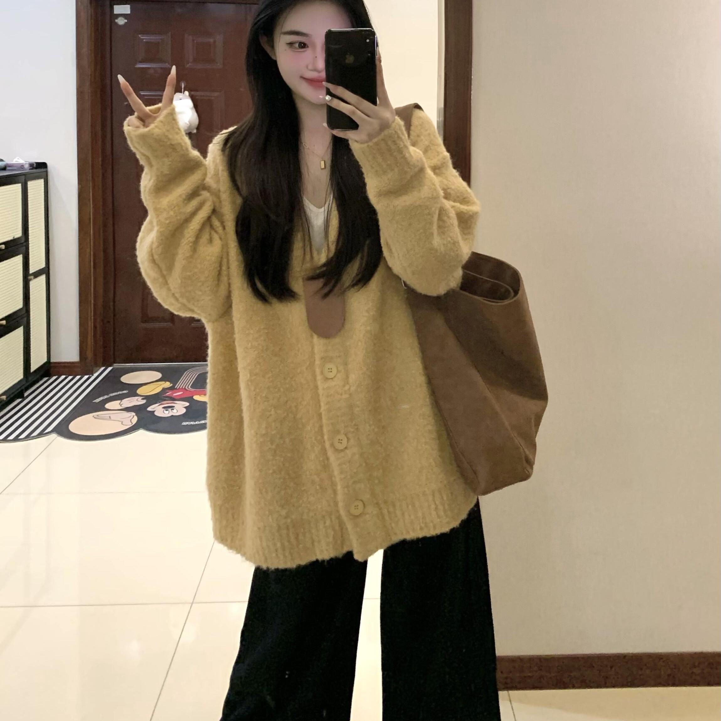 怠惰な風の柔らかいモチのvネックの外はセーターの女性の秋冬のゆったりした感を掛けてニットのコートのカーディガンの上着を厚くします。