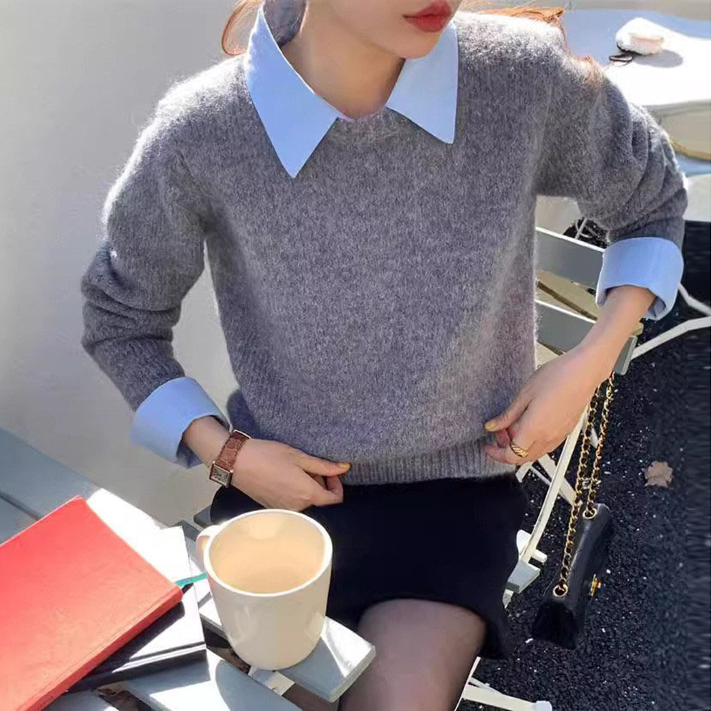 日本製パッチワークシャツ襟フェイクツーピースセーター秋冬新作セータースリムで万能なセーターレディーストップス