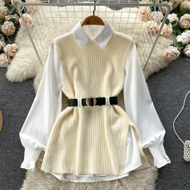 秋冬のゆったりとした長袖白いポロカラートップス、スリット入りベストセーター、軽くて豪華なレディーススーツ、女性用ニットセーター