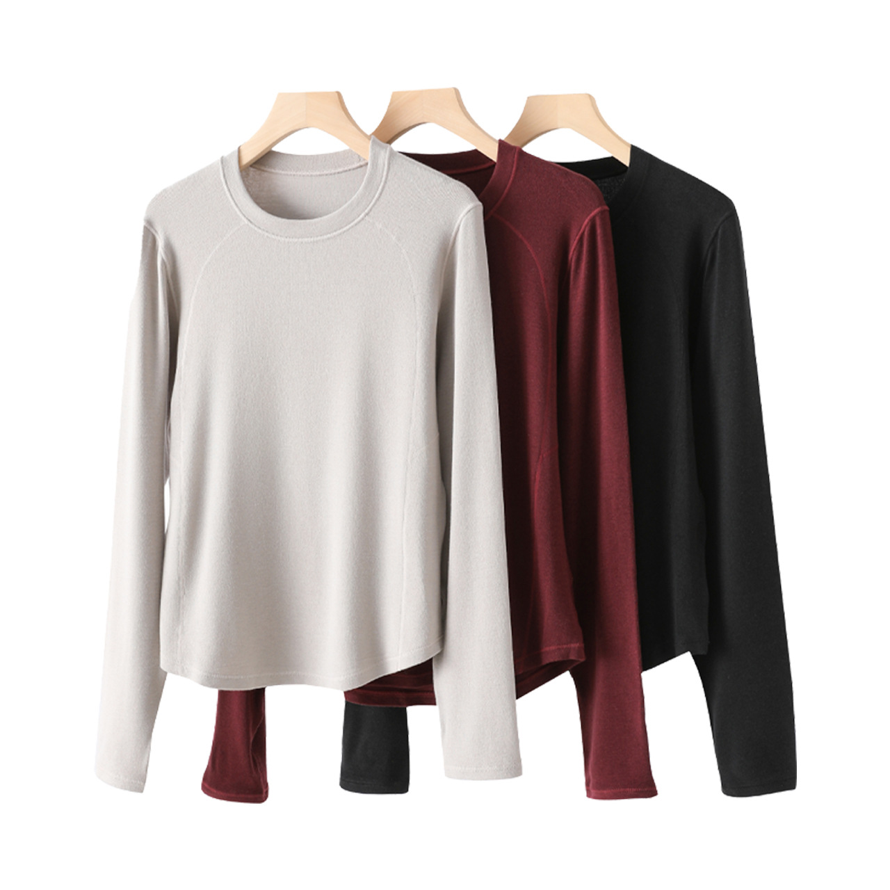 秋季新款版下摆圆弧圆领修身纯色长袖T恤上衣内搭女