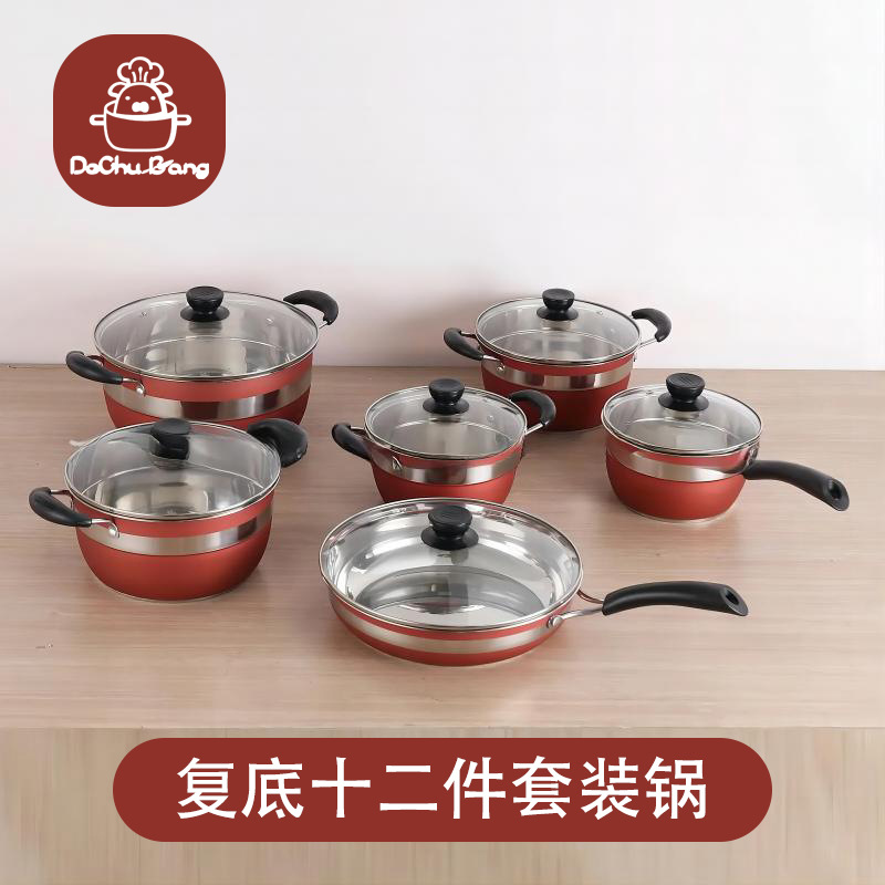 ステンレスの12セットの鍋の対外貿易は底のスープの鍋の乳の鍋のフライパンの組み合わせの鍋のセットの国境を越えて供給します。
