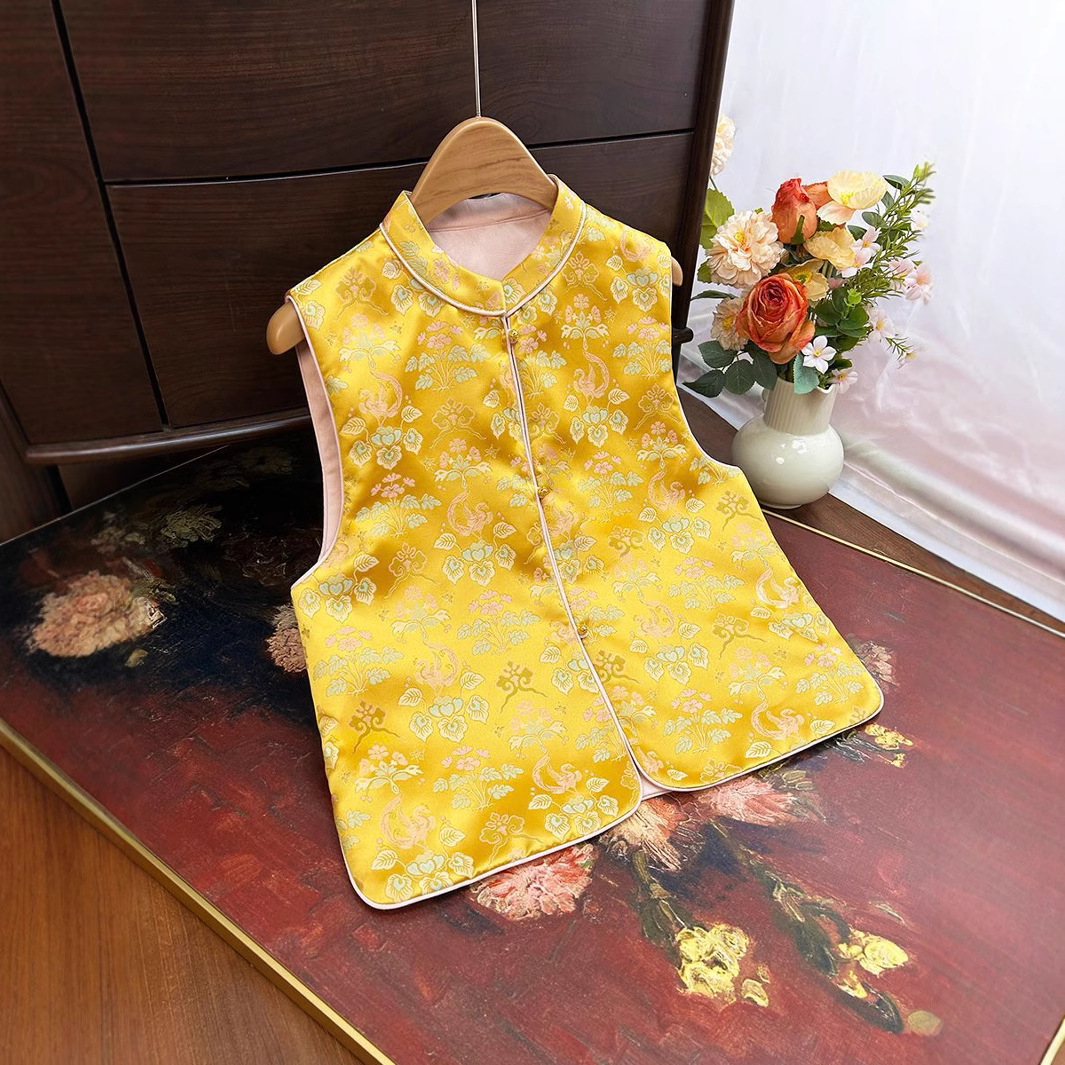 新中国風の国風の両面は馬甲の女性を着て2025春の新型の高級な気質の薄い色の錦のサテンの肩の馬の挟みを着ます。