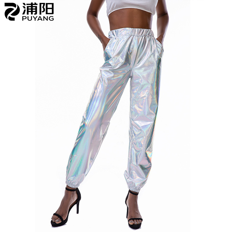 跨境爆款实物拍照休闲运动街头嘻哈派对闪亮幻彩长裤镭射宽松女裤