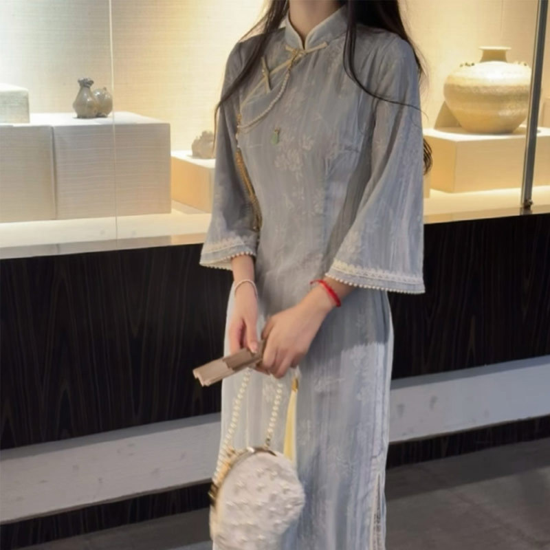 俏娘魚ブルーレトロ風新中式古法全開襟旗袍女性用2025春新作国民風改良日常着