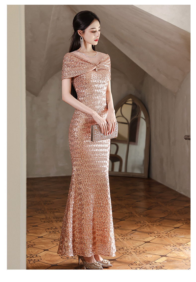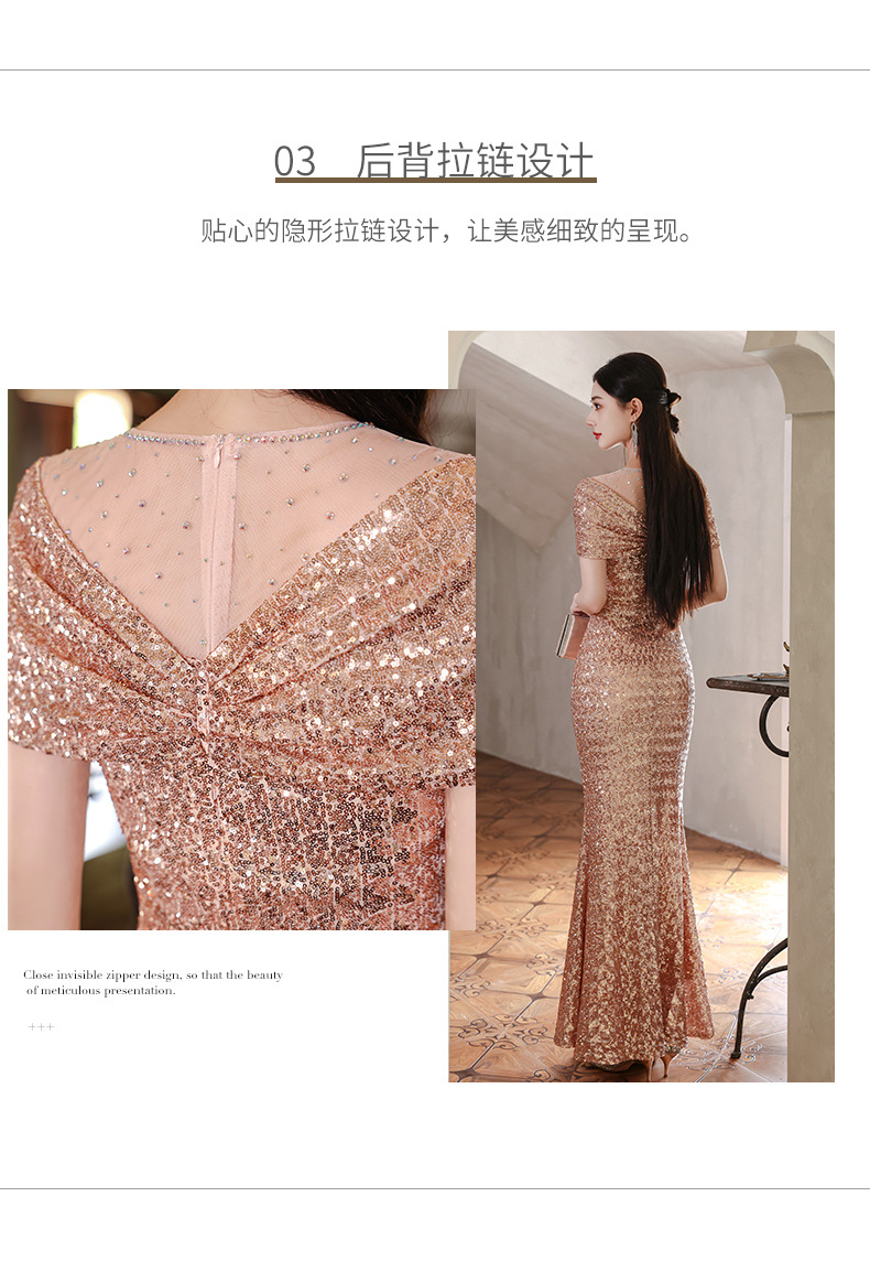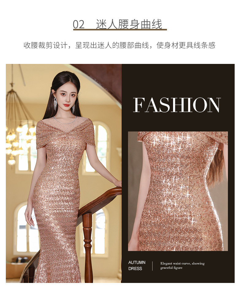 イブニングドレス、高級ロングドレス、新しいゴールデンレディース絶妙なフィッシュテールドレス、エレガントな宴会ホストスパンコールドレス