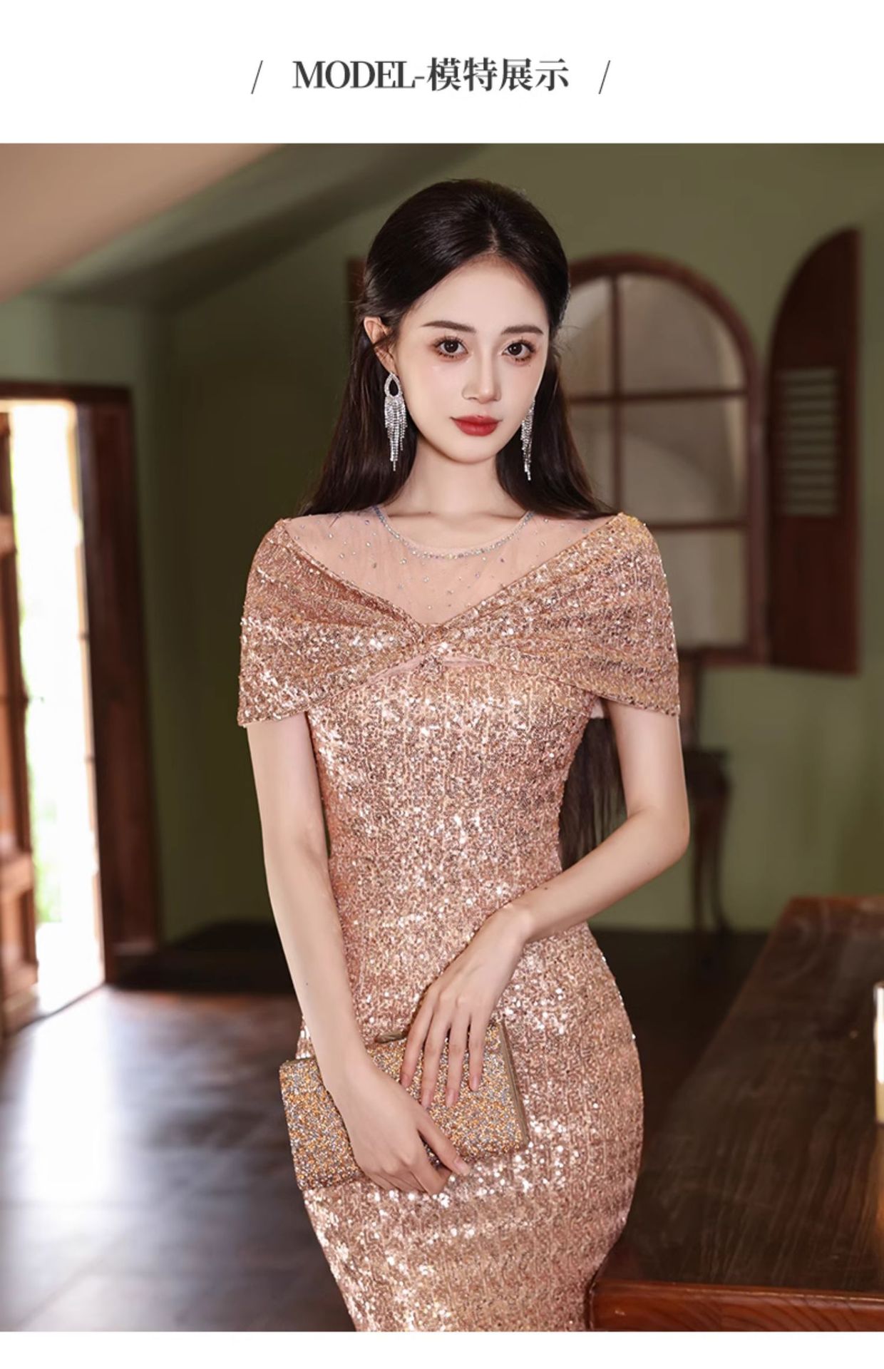 新しい女性のスパンコールドレス女性の夏の社交界の気質フィッシュテールロングスカートライト高級ハイエンドイブニングドレス供給