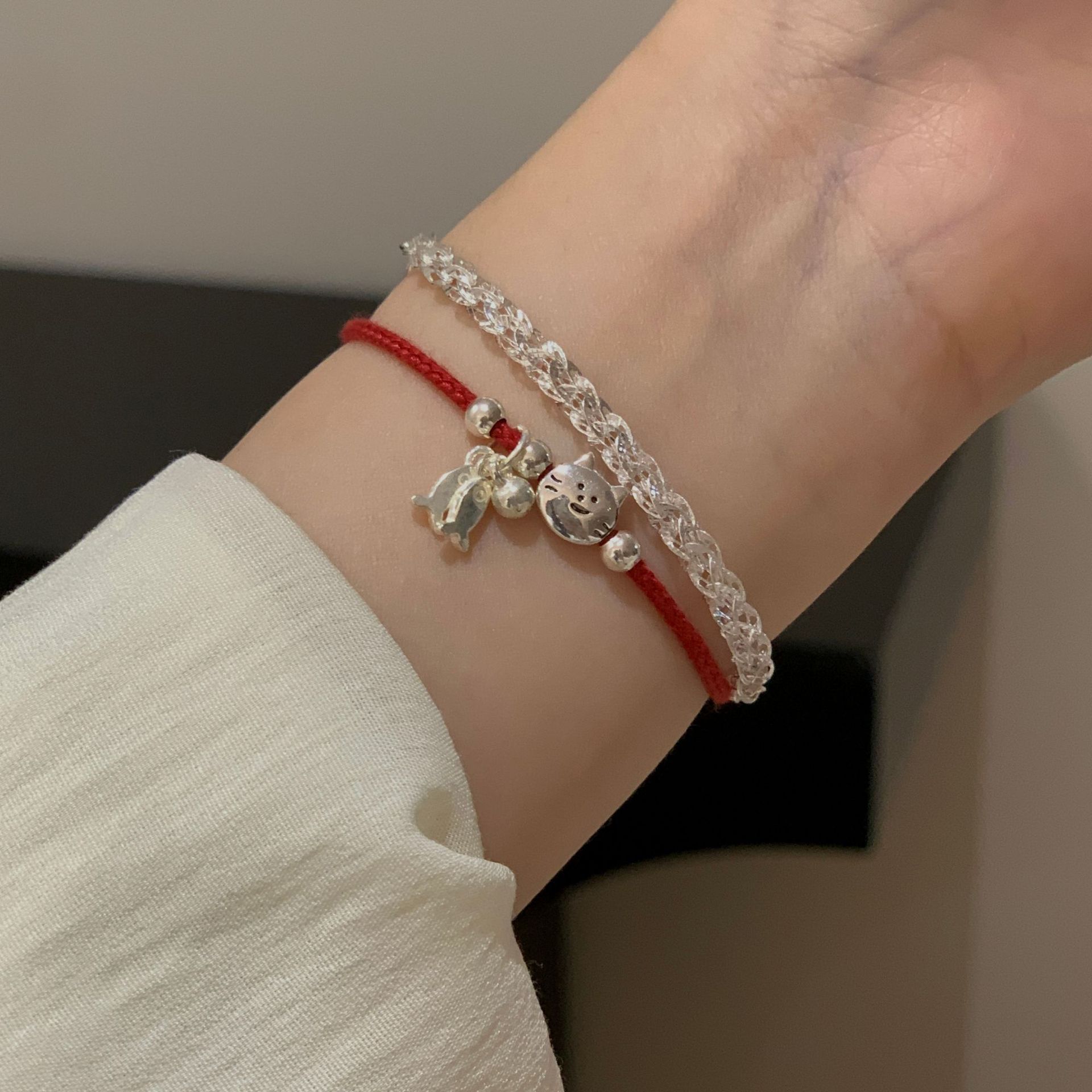 韩版S925纯银猫咪小鱼红绳手链女时髦简约新年款手绳银饰批发品