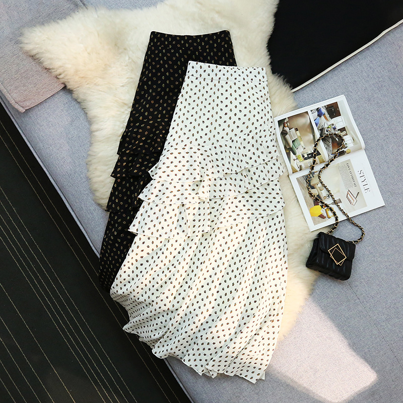夏の新型の不規則な波点のハスの葉の辺の砕花のケーキのスカートはやせているA字の半身のスカートの女性を現します。