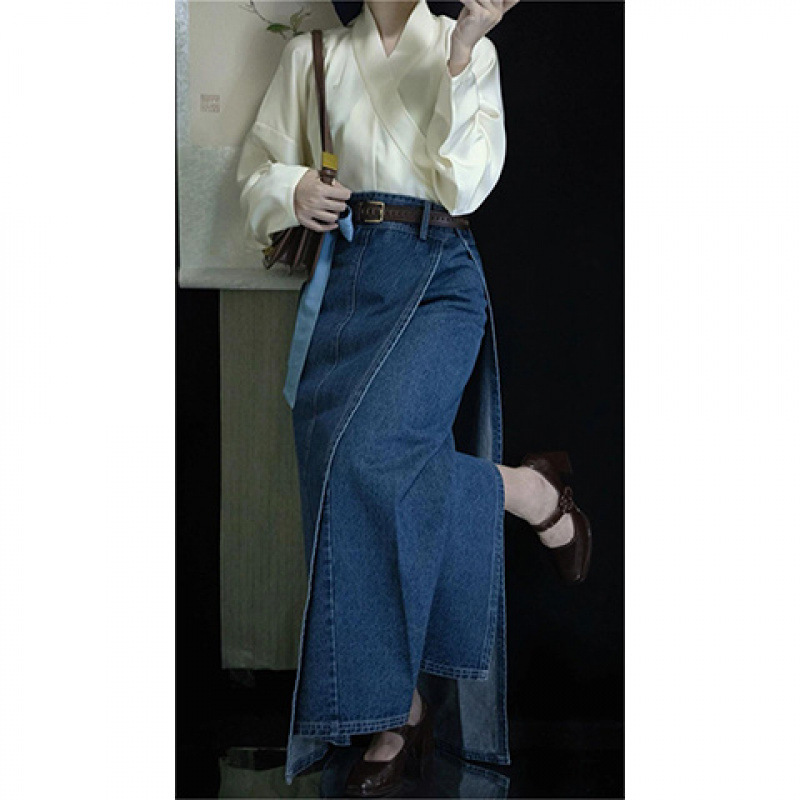 春季设计感不规则高腰显瘦牛仔半身裙女新款复古遮胯A字一步长裙
