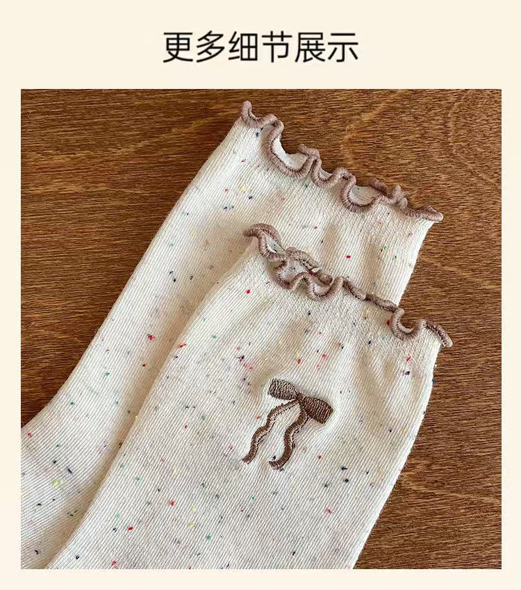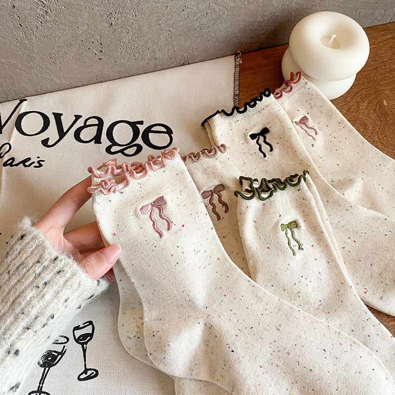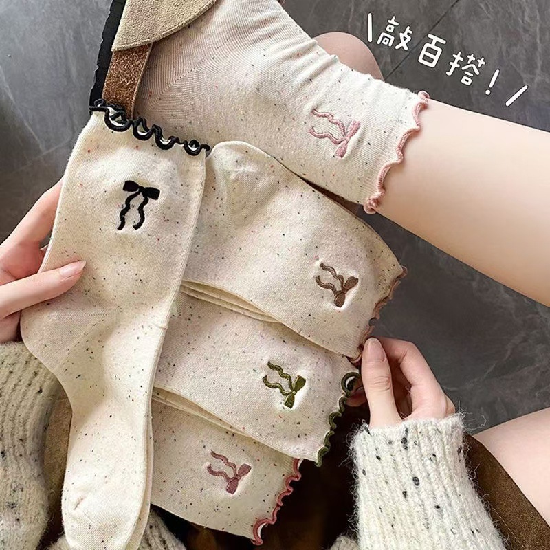 秋物新品iu系风蝶結びレディースソックス森系アイデアヤーン木耳サイド刺繍レディースコットンソックスミドルソックス