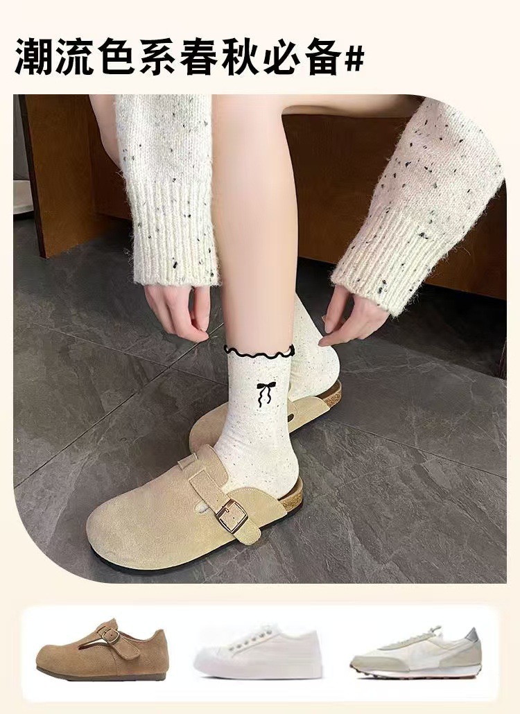 外履き用木製風飾り付きソックス レディース 春秋 韓国風 ミドル丈ソックス リボン付き インスタ映え シンプルで万能 学生向け 甘くて可愛い