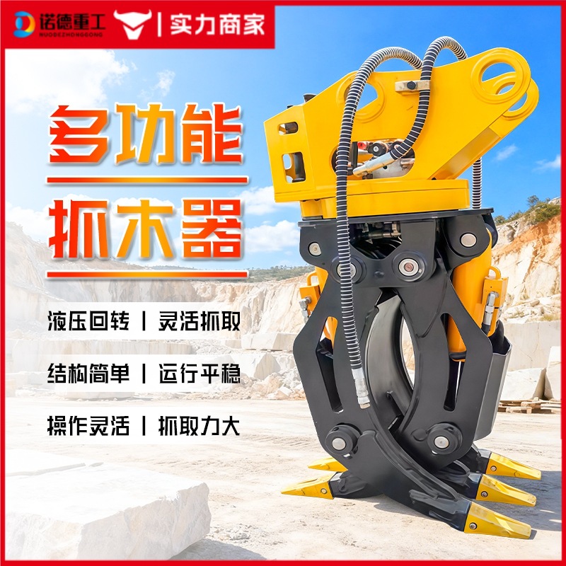 掘削機は油圧で木をつかみます。360度回転します。